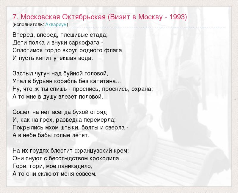 Вперед, вперед, плешивые стада; Дети полка и внуки саркофага - Сплотимся гордо вкруг родного флага, И пусть кипит утекшая вода. Застыл чугун над буйной головой, Упал в бурьян корабль без капитана... Ну, что ж ты спишь - проснись, проснись, охрана; А то мне в душу влезет половой. Сошел на нет всегда бухой отряд И, как на грех, разведка перемерла; Покрылись мхом штыки, болты и сверла - А в небе бабы голые летят. На их грудях блестит французский крем; Они снуют с бесстыдством крокодила... Гори, гори, мое паникадило, А то они склюют меня совсем.