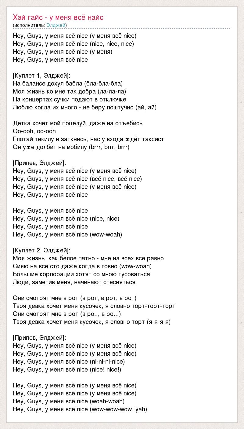 Hey, Guys, у меня всё nice (у меня всё nice) Hey, Guys, у меня всё nice (nice, nice, nice) Hey, Guys, у меня всё nice (у меня) Hey, Guys, у меня всё nice [Куплет 1, Элджей]: На балансе дохуя бабла (бла-бла-бла) Моя жизнь ко мне так добра (ла-ла-ла) На концертах сучки подают в отключке Люблю когда их много - не беру поштучно (ай, ай) Детка хочет мой поцелуй, даже на отъебись Oo-ooh, oo-ooh Глотай текилу и заткнись, нас у входа ждёт таксист Он уже долбит на мобилу (brrr, brrr, brrr) [Припев, Элджей]: Hey, Guys, у меня всё nice (у меня всё nice) Hey, Guys, у меня всё nice (всё nice, всё nice) Hey, Guys, у меня всё nice (у меня всё nice) Hey, Guys, у меня всё nice Hey, Guys, у меня всё nice Hey, Guys, у меня всё nice (nice, nice) Hey, Guys, у меня всё nice Hey, Guys, у меня всё nice (wow-woah) [Куплет 2, Элджей]: Моя жизнь, как белое пятно - мне на всех всё равно Сияю на все сто даже когда в говно (wow-woah) Большие корпорации хотят со мною тусоваться Люди, заметив меня, начинают стесняться Они смотрят мне в рот (в рот, в рот, в рот) Твоя девка хочет меня кусочек, я словно торт-торт-торт Они смотрят мне в рот (в ро.., в ро...) Твоя девка хочет меня кусочек, я словно торт (я-я-я-я) [Припев, Элджей]: Hey, Guys, у меня всё nice (у меня всё nice) Hey, Guys, у меня всё nice (у меня всё nice) Hey, Guys, у меня всё nice (ni-ni-ni-nice) Hey, Guys, у меня всё nice (nice! nice!) Hey, Guys, у меня всё nice (у меня всё nice) Hey, Guys, у меня всё nice (у меня всё nice) Hey, Guys, у меня всё nice (woah-woah) Hey, Guys, у меня всё nice (wow-wow-wow, yah)