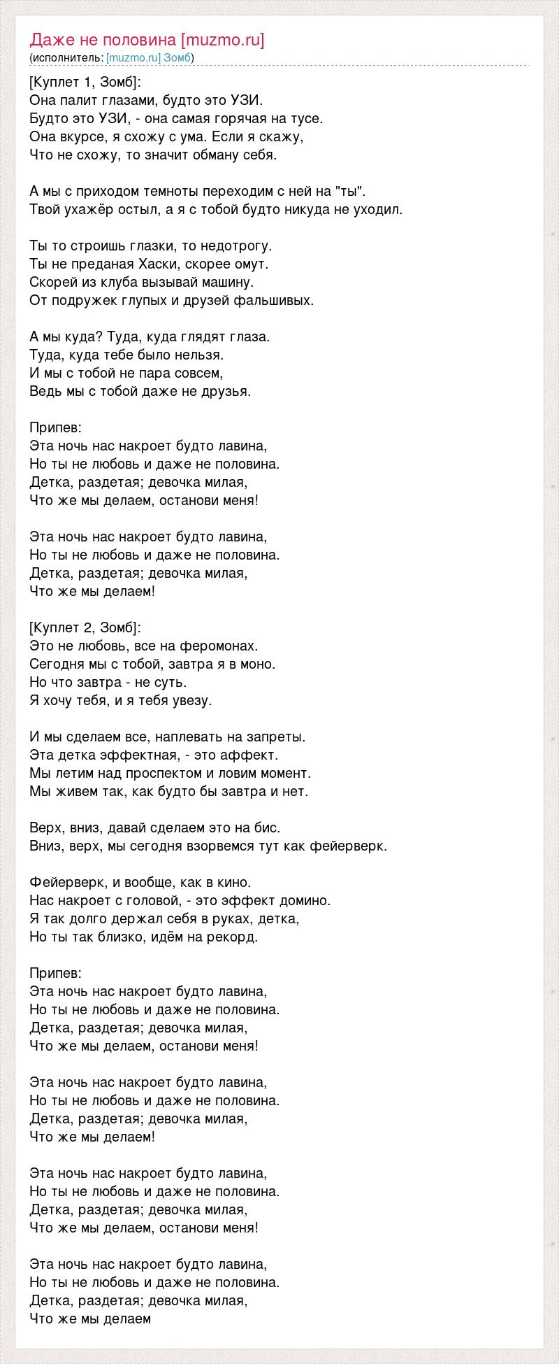 [Куплет 1, Зомб]: Она палит глазами, будто это УЗИ. Будто это УЗИ, - она самая горячая на тусе. Она вкурсе, я схожу с ума. Если я скажу, Что не схожу, то значит обману себя. А мы с приходом темноты переходим с ней на "ты". Твой ухажёр остыл, а я с тобой будто никуда не уходил. Ты то строишь глазки, то недотрогу. Ты не преданая Хаски, скорее омут. Скорей из клуба вызывай машину. От подружек глупых и друзей фальшивых. А мы куда? Туда, куда глядят глаза. Туда, куда тебе было нельзя. И мы с тобой не пара совсем, Ведь мы с тобой даже не друзья. Припев: Эта ночь нас накроет будто лавина, Но ты не любовь и даже не половина. Детка, раздетая; девочка милая, Что же мы делаем, останови меня! Эта ночь нас накроет будто лавина, Но ты не любовь и даже не половина. Детка, раздетая; девочка милая, Что же мы делаем! [Куплет 2, Зомб]: Это не любовь, все на феромонах. Сегодня мы с тобой, завтра я в моно. Но что завтра - не суть. Я хочу тебя, и я тебя увезу. И мы сделаем все, наплевать на запреты. Эта детка эффектная, - это аффект. Мы летим над проспектом и ловим момент. Мы живем так, как будто бы завтра и нет. Верх, вниз, давай сделаем это на бис. Вниз, верх, мы сегодня взорвемся тут как фейерверк. Фейерверк, и вообще, как в кино. Нас накроет с головой, - это эффект домино. Я так долго держал себя в руках, детка, Но ты так близко, идём на рекорд. Припев: Эта ночь нас накроет будто лавина, Но ты не любовь и даже не половина. Детка, раздетая; девочка милая, Что же мы делаем, останови меня! Эта ночь нас накроет будто лавина, Но ты не любовь и даже не половина. Детка, раздетая; девочка милая, Что же мы делаем! Эта ночь нас накроет будто лавина, Но ты не любовь и даже не половина. Детка, раздетая; девочка милая, Что же мы делаем, останови меня! Эта ночь нас накроет будто лавина, Но ты не любовь и даже не половина. Детка, раздетая; девочка милая, Что же мы делаем