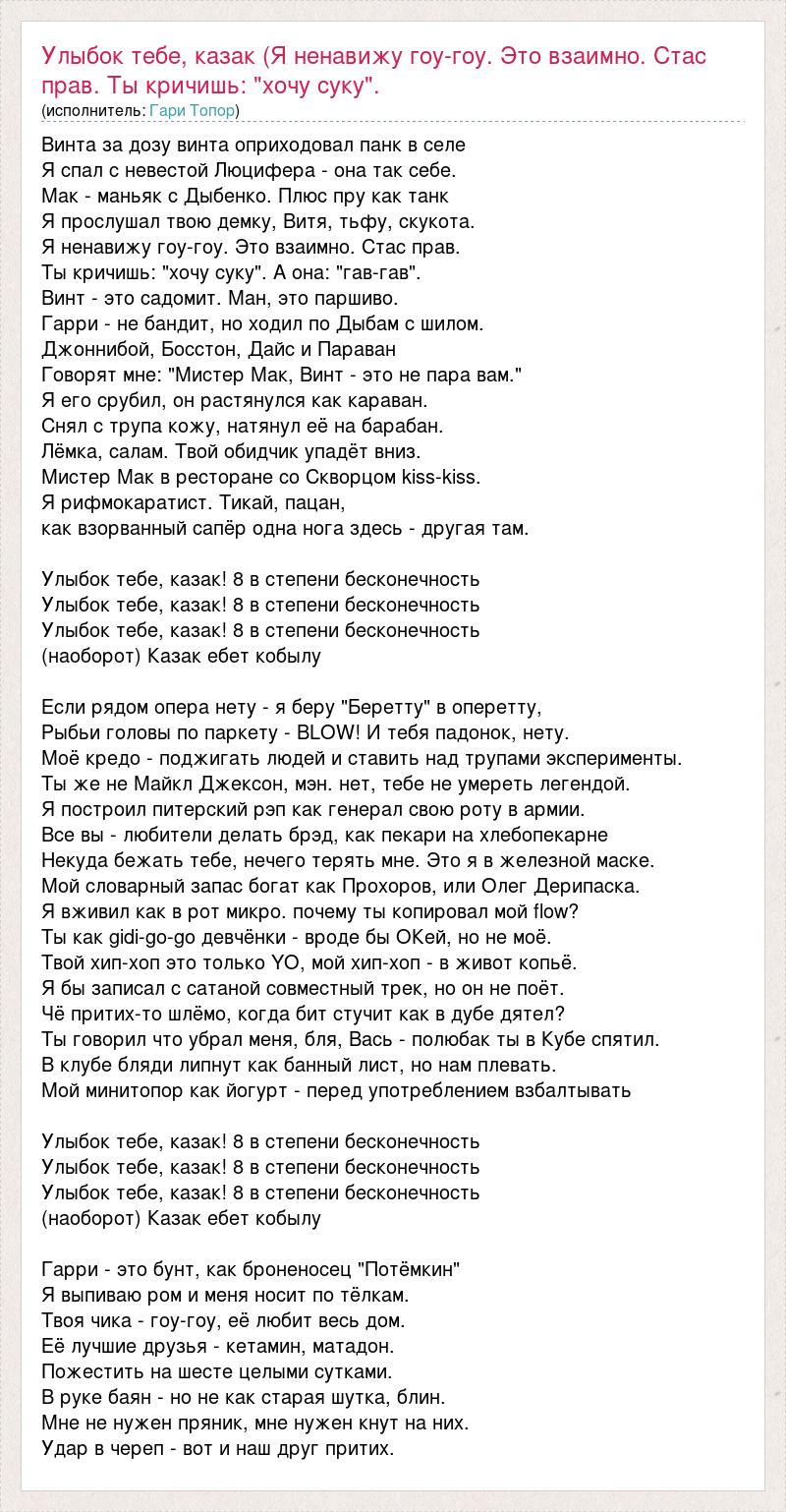 Винта за дозу винта оприходовал панк в селе Я спал с невестой Люцифера - она так себе. Мак - маньяк с Дыбенко. Плюс пру как танк Я прослушал твою демку, Витя, тьфу, скукота. Я ненавижу гоу-гоу. Это взаимно. Стас прав. Ты кричишь: "хочу суку". А она: "гав-гав". Винт - это садомит. Ман, это паршиво. Гарри - не бандит, но ходил по Дыбам с шилом. Джоннибой, Босстон, Дайс и Параван Говорят мне: "Мистер Мак, Винт - это не пара вам." Я его срубил, он растянулся как караван. Снял с трупа кожу, натянул её на барабан. Лёмка, салам. Твой обидчик упадёт вниз. Мистер Мак в ресторане со Скворцом kiss-kiss. Я рифмокаратист. Тикай, пацан, как взорванный сапёр одна нога здесь - другая там. Улыбок тебе, казак! 8 в степени бесконечность Улыбок тебе, казак! 8 в степени бесконечность Улыбок тебе, казак! 8 в степени бесконечность (наоборот) Казак ебет кобылу Если рядом опера нету - я беру "Беретту" в оперетту, Рыбьи головы по паркету - BLOW! И тебя падонок, нету. Моё кредо - поджигать людей и ставить над трупами эксперименты. Ты же не Майкл Джексон, мэн. нет, тебе не умереть легендой. Я построил питерский рэп как генерал свою роту в армии. Все вы - любители делать брэд, как пекари на хлебопекарне Некуда бежать тебе, нечего терять мне. Это я в железной маске. Мой словарный запас богат как Прохоров, или Олег Дерипаска. Я вживил как в рот микро. почему ты копировал мой flow? Ты как gidi-go-go девчёнки - вроде бы ОКей, но не моё. Твой хип-хоп это только YO, мой хип-хоп - в живот копьё. Я бы записал с сатаной совместный трек, но он не поёт. Чё притих-то шлёмо, когда бит стучит как в дубе дятел? Ты говорил что убрал меня, бля, Вась - полюбак ты в Кубе спятил. В клубе бляди липнут как банный лист, но нам плевать. Мой минитопор как йогурт - перед употреблением взбалтывать Улыбок тебе, казак! 8 в степени бесконечность Улыбок тебе, казак! 8 в степени бесконечность Улыбок тебе, казак! 8 в степени бесконечность (наоборот) Казак ебет кобылу Гарри - это бунт, как броненосец "Потёмкин" Я выпиваю ром и меня носит по тёлкам. Твоя чика - гоу-гоу, её любит весь дом. Её лучшие друзья - кетамин, матадон. Пожестить на шесте целыми сутками. В руке баян - но не как старая шутка, блин. Мне не нужен пряник, мне нужен кнут на них. Удар в череп - вот и наш друг притих.