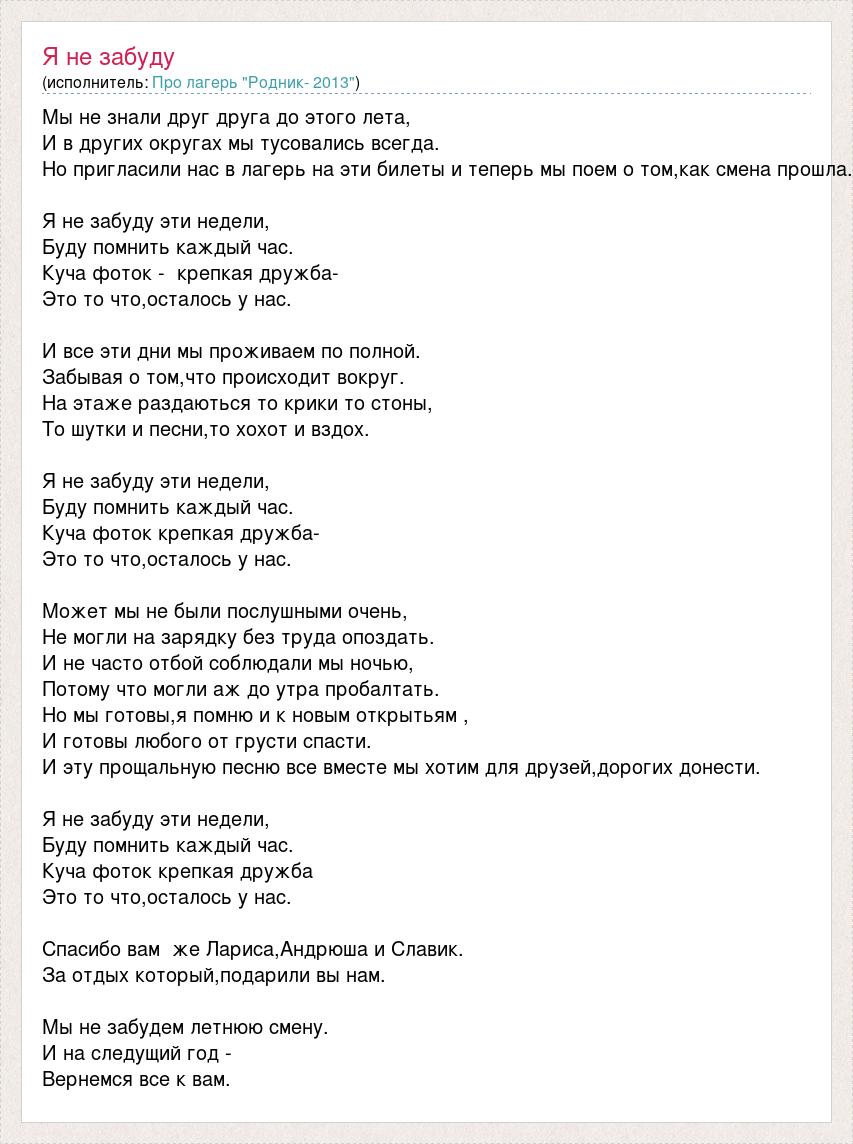 Мы не знали друг друга до этого лета, И в других округах мы тусовались всегда. Но пригласили нас в лагерь на эти билеты и теперь мы поем о том,как смена прошла. Я не забуду эти недели, Буду помнить каждый час. Куча фоток - крепкая дружба- Это то что,осталось у нас. И все эти дни мы проживаем по полной. Забывая о том,что происходит вокруг. На этаже раздаються то крики то стоны, То шутки и песни,то хохот и вздох. Я не забуду эти недели, Буду помнить каждый час. Куча фоток крепкая дружба- Это то что,осталось у нас. Может мы не были послушными очень, Не могли на зарядку без труда опоздать. И не часто отбой соблюдали мы ночью, Потому что могли аж до утра пробалтать. Но мы готовы,я помню и к новым открытьям , И готовы любого от грусти спасти. И эту прощальную песню все вместе мы хотим для друзей,дорогих донести. Я не забуду эти недели, Буду помнить каждый час. Куча фоток крепкая дружба Это то что,осталось у нас. Спасибо вам же Лариса,Андрюша и Славик. За отдых который,подарили вы нам. Мы не забудем летнюю смену. И на следущий год - Вернемся все к вам.