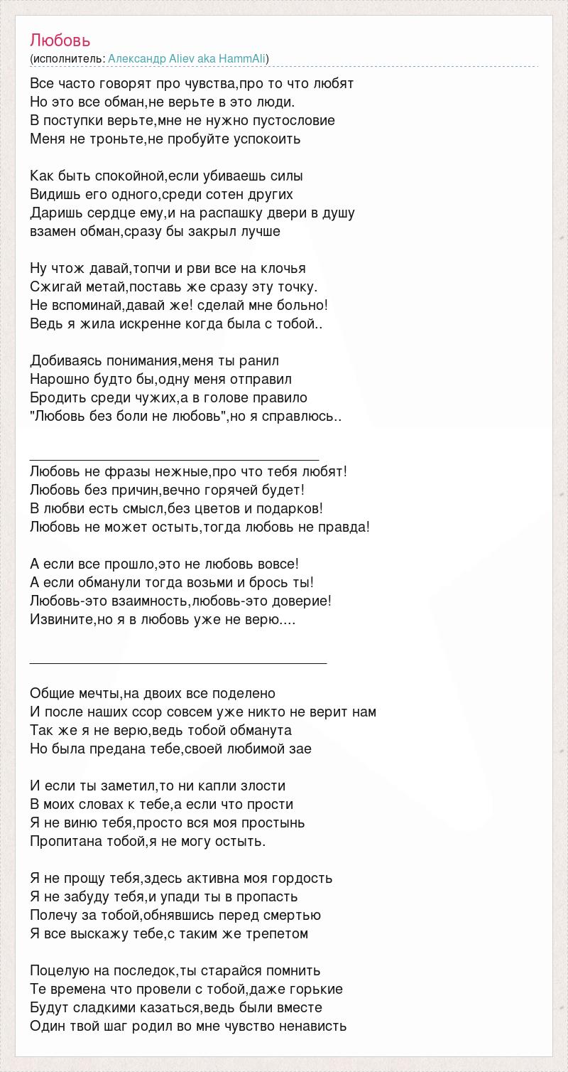 Все часто говорят про чувства,про то что любят Но это все обман,не верьте в это люди. В поступки верьте,мне не нужно пустословие Меня не троньте,не пробуйте успокоить Как быть спокойной,если убиваешь силы Видишь его одного,среди сотен других Даришь сердце ему,и на распашку двери в душу взамен обман,сразу бы закрыл лучше Ну чтож давай,топчи и рви все на клочья Сжигай метай,поставь же сразу эту точку. Не вспоминай,давай же! сделай мне больно! Ведь я жила искренне когда была с тобой.. Добиваясь понимания,меня ты ранил Нарошно будто бы,одну меня отправил Бродить среди чужих,а в голове правило "Любовь без боли не любовь",но я справлюсь.. _____________________________________ Любовь не фразы нежные,про что тебя любят! Любовь без причин,вечно горячей будет! В любви есть смысл,без цветов и подарков! Любовь не может остыть,тогда любовь не правда! А если все прошло,это не любовь вовсе! А если обманули тогда возьми и брось ты! Любовь-это взаимность,любовь-это доверие! Извините,но я в любовь уже не верю.... ______________________________________ Общие мечты,на двоих все поделено И после наших ссор совсем уже никто не верит нам Так же я не верю,ведь тобой обманута Но была предана тебе,своей любимой зае И если ты заметил,то ни капли злости В моих словах к тебе,а если что прости Я не виню тебя,просто вся моя простынь Пропитана тобой,я не могу остыть. Я не прощу тебя,здесь активна моя гордость Я не забуду тебя,и упади ты в пропасть Полечу за тобой,обнявшись перед смертью Я все выскажу тебе,с таким же трепетом Поцелую на последок,ты старайся помнить Те времена что провели с тобой,даже горькие Будут сладкими казаться,ведь были вместе Один твой шаг родил во мне чувство ненависть