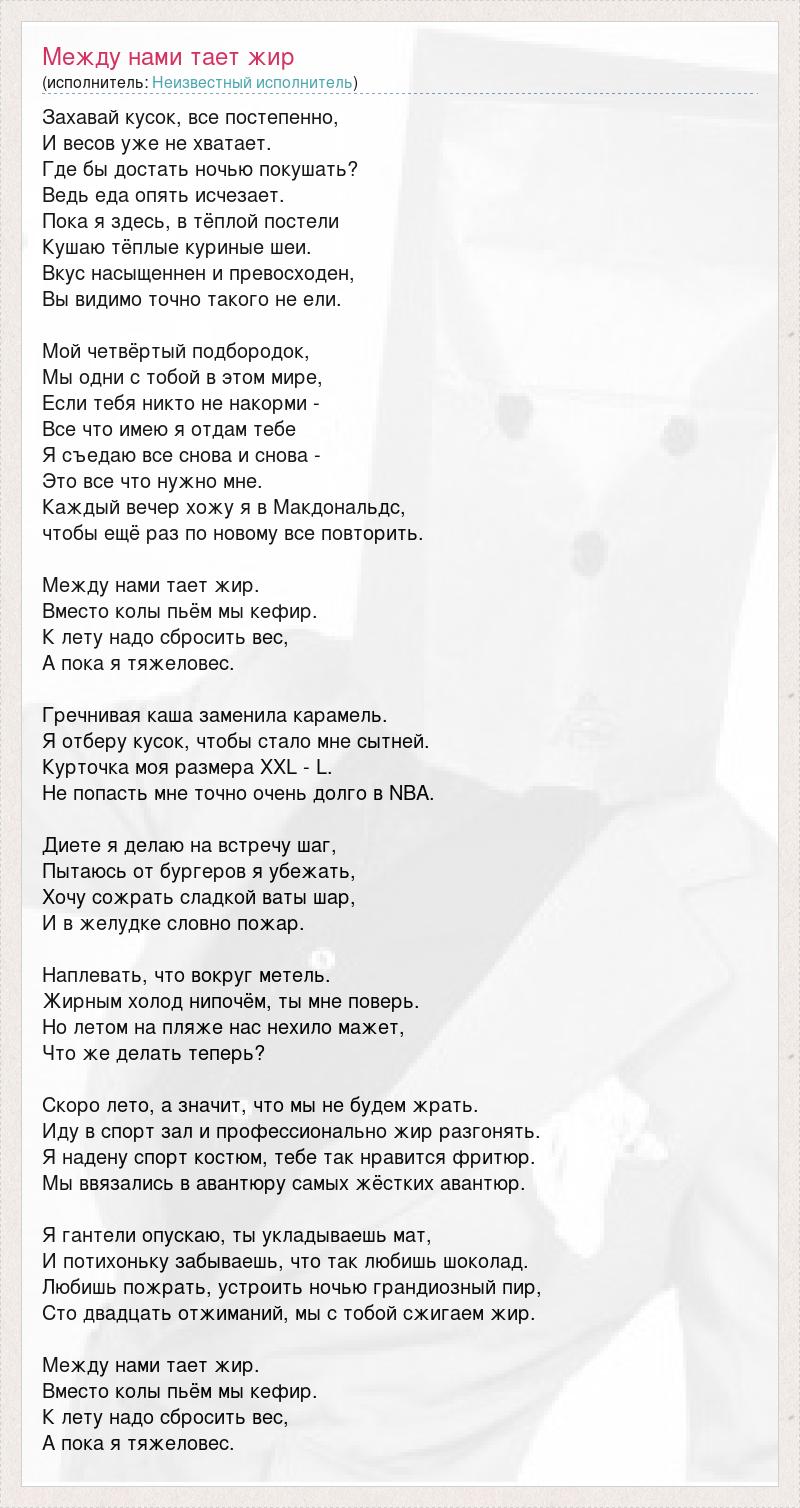 Захавай кусок, все постепенно, И весов уже не хватает. Где бы достать ночью покушать? Ведь еда опять исчезает. Пока я здесь, в тёплой постели Кушаю тёплые куриные шеи. Вкус насыщеннен и превосходен, Вы видимо точно такого не ели. Мой четвёртый подбородок, Мы одни с тобой в этом мире, Если тебя никто не накорми - Все что имею я отдам тебе Я съедаю все снова и снова - Это все что нужно мне. Каждый вечер хожу я в Макдональдс, чтобы ещё раз по новому все повторить. Между нами тает жир. Вместо колы пьём мы кефир. К лету надо сбросить вес, А пока я тяжеловес. Гречнивая каша заменила карамель. Я отберу кусок, чтобы стало мне сытней. Курточка моя размера ХХL - L. Не попасть мне точно очень долго в NBA. Диете я делаю на встречу шаг, Пытаюсь от бургеров я убежать, Хочу сожрать сладкой ваты шар, И в желудке словно пожар. Наплевать, что вокруг метель. Жирным холод нипочём, ты мне поверь. Но летом на пляже нас нехило мажет, Что же делать теперь? Скоро лето, а значит, что мы не будем жрать. Иду в спорт зал и профессионально жир разгонять. Я надену спорт костюм, тебе так нравится фритюр. Мы ввязались в авантюру самых жёстких авантюр. Я гантели опускаю, ты укладываешь мат, И потихоньку забываешь, что так любишь шоколад. Любишь пожрать, устроить ночью грандиозный пир, Сто двадцать отжиманий, мы с тобой сжигаем жир. Между нами тает жир. Вместо колы пьём мы кефир. К лету надо сбросить вес, А пока я тяжеловес.