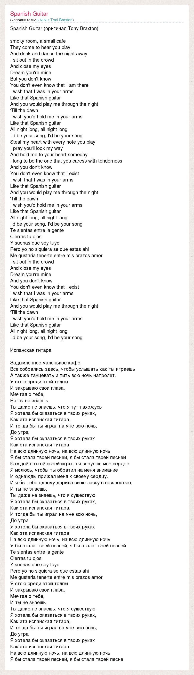 Spanish Guitar (оригинал Tony Braxton) smoky room, a small cafe They come to hear you play And drink and dance the night away I sit out in the crowd And close my eyes Dream you're mine But you don't know You don't even know that I am there I wish that I was in your arms Like that Spanish guitar And you would play me through the night 'Till the dawn I wish you'd hold me in your arms Like that Spanish guitar All night long, all night long I'd be your song, I'd be your song Steal my heart with every note you play I pray you'll look my way And hold me to your heart someday I long to be the one that you caress with tenderness And you don't know You don't even know that I exist I wish that I was in your arms Like that Spanish guitar And you would play me through the night 'Till the dawn I wish you'd hold me in your arms Like that Spanish guitar All night long, all night long I'd be your song, I'd be your song Te sientas entre la gente Cierras tu ojos Y suenas que soy tuyo Pero yo no siquiera se que estas ahi Me gustaria tenerte entre mis brazos amor I sit out in the crowd And close my eyes Dream you're mine And you don't know You don't even know that I exist I wish that I was in your arms Like that Spanish guitar And you would play me through the night 'Till the dawn I wish you'd hold me in your arms Like that Spanish guitar All night long, all night long I'd be your song, I'd be your song Испанская гитара Задымленное маленькое кафе, Все собрались здесь, чтобы услышать как ты играешь А также танцевать и пить всю ночь напролет. Я стою среди этой толпы И закрываю свои глаза, Мечтая о тебе, Но ты не знаешь, Ты даже не знаешь, что я тут нахожусь Я хотела бы оказаться в твоих руках, Как эта испанская гитара, И тогда бы ты играл на мне всю ночь, До утра Я хотела бы оказаться в твоих руках Как эта испанская гитара На всю длинную ночь, на всю длинную ночь Я бы стала твоей песней, я бы стала твоей песней Каждой ноткой своей игры, ты воруешь мое сердце Я молюсь, чтобы ты обратил на меня внимание И однажды прижал меня к своему сердцу. И я бы тебе одному дарила свою ласку с нежностью, И ты не знаешь, Ты даже не знаешь, что я существую Я хотела бы оказаться в твоих руках, Как эта испанская гитара, И тогда бы ты играл на мне всю ночь, До утра Я хотела бы оказаться в твоих руках Как эта испанская гитара На всю длинную ночь, на всю длинную ночь Я бы стала твоей песней, я бы стала твоей песней Te sientas entre la gente Cierras tu ojos Y suenas que soy tuyo Pero yo no siquiera se que estas ahi Me gustaria tenerte entre mis brazos amor Я стою среди этой толпы И закрываю свои глаза, Мечтая о тебе, И ты не знаешь Ты даже не знаешь, что я существую Я хотела бы оказаться в твоих руках, Как эта испанская гитара, И тогда бы ты играл на мне всю ночь, До утра Я хотела бы оказаться в твоих руках Как эта испанская гитара На всю длинную ночь, на всю длинную ночь Я бы стала твоей песней, я бы стала твоей песне