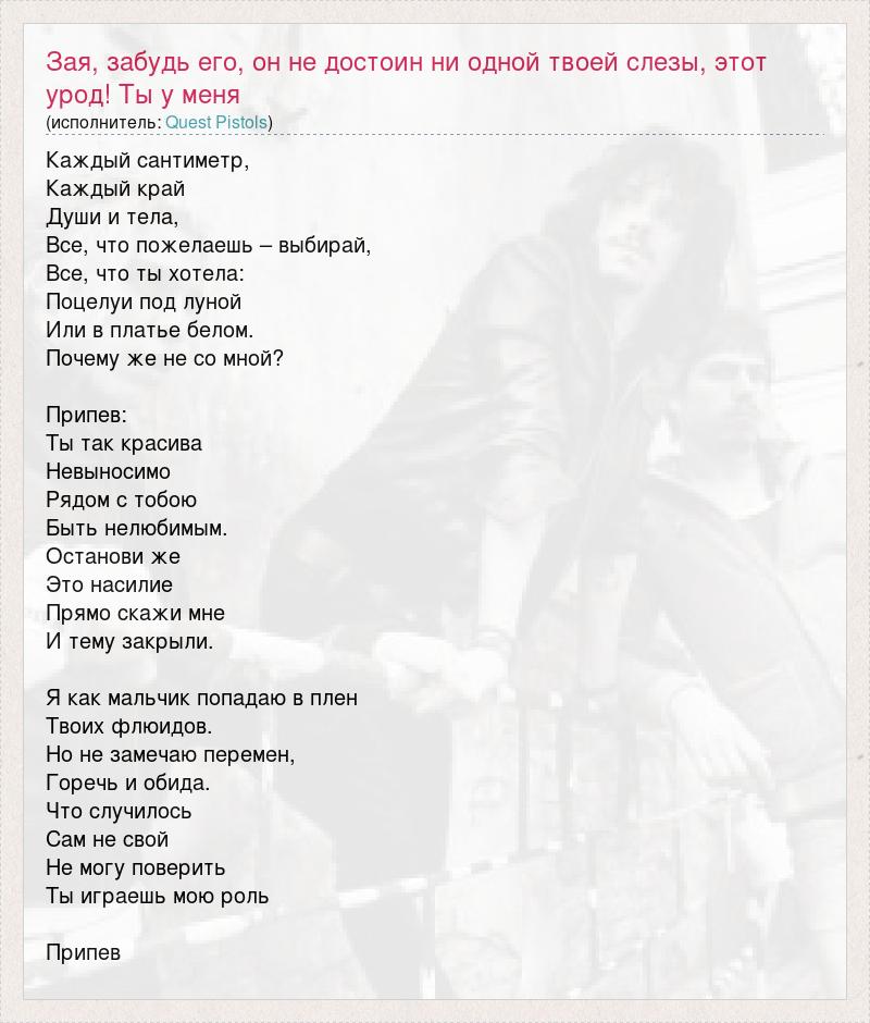 Каждый сантиметр, Каждый край Души и тела, Все, что пожелаешь – выбирай, Все, что ты хотела: Поцелуи под луной Или в платье белом. Почему же не со мной? Припев: Ты так красива Невыносимо Рядом с тобою Быть нелюбимым. Останови же Это насилие Прямо скажи мне И тему закрыли. Я как мальчик попадаю в плен Твоих флюидов. Но не замечаю перемен, Горечь и обида. Что случилось Сам не свой Не могу поверить Ты играешь мою роль Припев