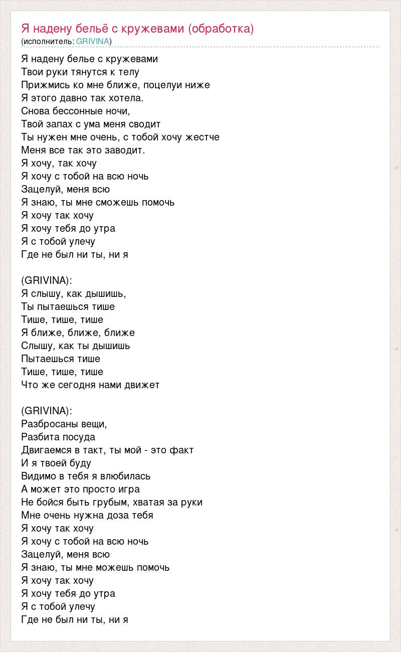 Я надену белье с кружевами Твои руки тянутся к телу Прижмись ко мне ближе, поцелуи ниже Я этого давно так хотела. Снова бессонные ночи, Твой запах с ума меня сводит Ты нужен мне очень, с тобой хочу жестче Меня все так это заводит. Я хочу, так хочу Я хочу с тобой на всю ночь Зацелуй, меня всю Я знаю, ты мне сможешь помочь Я хочу так хочу Я хочу тебя до утра Я с тобой улечу Где не был ни ты, ни я (GRIVINA): Я слышу, как дышишь, Ты пытаешься тише Тише, тише, тише Я ближе, ближе, ближе Слышу, как ты дышишь Пытаешься тише Тише, тише, тише Что же сегодня нами движет (GRIVINA): Разбросаны вещи, Разбита посуда Двигаемся в такт, ты мой - это факт И я твоей буду Видимо в тебя я влюбилась А может это просто игра Не бойся быть грубым, хватая за руки Мне очень нужна доза тебя Я хочу так хочу Я хочу с тобой на всю ночь Зацелуй, меня всю Я знаю, ты мне можешь помочь Я хочу так хочу Я хочу тебя до утра Я с тобой улечу Где не был ни ты, ни я