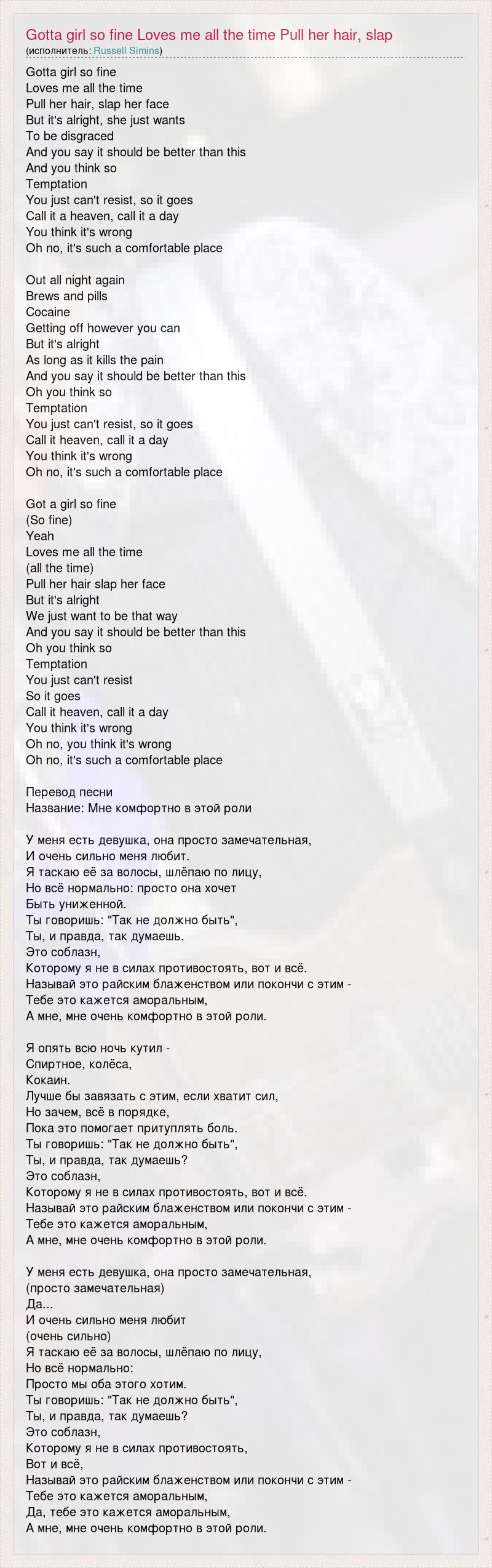 Gotta girl so fine Loves me all the time Pull her hair, slap her face But it's alright, she just wants To be disgraced And you say it should be better than this And you think so Temptation You just can't resist, so it goes Call it a heaven, call it a day You think it's wrong Oh no, it's such a comfortable place Out all night again Brews and pills Cocaine Getting off however you can But it's alright As long as it kills the pain And you say it should be better than this Oh you think so Temptation You just can't resist, so it goes Call it heaven, call it a day You think it's wrong Oh no, it's such a comfortable place Got a girl so fine (So fine) Yeah Loves me all the time (all the time) Pull her hair slap her face But it's alright We just want to be that way And you say it should be better than this Oh you think so Temptation You just can't resist So it goes Call it heaven, call it a day You think it's wrong Oh no, you think it's wrong Oh no, it's such a comfortable place Перевод песни Название: Мне комфортно в этой роли У меня есть девушка, она просто замечательная, И очень сильно меня любит. Я таскаю её за волосы, шлёпаю по лицу, Но всё нормально: просто она хочет Быть униженной. Ты говоришь: "Так не должно быть", Ты, и правда, так думаешь. Это соблазн, Которому я не в силах противостоять, вот и всё. Называй это райским блаженством или покончи с этим - Тебе это кажется аморальным, А мне, мне очень комфортно в этой роли. Я опять всю ночь кутил - Спиртное, колёса, Кокаин. Лучше бы завязать с этим, если хватит сил, Но зачем, всё в порядке, Пока это помогает притуплять боль. Ты говоришь: "Так не должно быть", Ты, и правда, так думаешь? Это соблазн, Которому я не в силах противостоять, вот и всё. Называй это райским блаженством или покончи с этим - Тебе это кажется аморальным, А мне, мне очень комфортно в этой роли. У меня есть девушка, она просто замечательная, (просто замечательная) Да... И очень сильно меня любит (очень сильно) Я таскаю её за волосы, шлёпаю по лицу, Но всё нормально: Просто мы оба этого хотим. Ты говоришь: "Так не должно быть", Ты, и правда, так думаешь? Это соблазн, Которому я не в силах противостоять, Вот и всё, Называй это райским блаженством или покончи с этим - Тебе это кажется аморальным, Да, тебе это кажется аморальным, А мне, мне очень комфортно в этой роли.