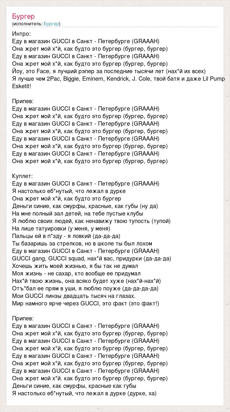 Интро: Еду в магазин GUCCI в Санкт - Петербурге (GRAAAH) Она жрет мой х*й, как будто это бургер (бургер, бургер) Еду в магазин GUCCI в Санкт - Петербурге (GRAAAH) Она жрет мой х*й, как будто это бургер (бургер, бургер) Йоу, это Face, я лучший рэпер за последние тысячи лет (нах*й их всех) Я лучше чем 2Pac, Biggie, Eminem, Kendrick, J. Cole, твой батя и даже Lil Pump Esketit! Припев: Еду в магазин GUCCI в Санкт - Петербурге (GRAAAH) Она жрет мой х*й, как будто это бургер (бургер, бургер) Еду в магазин GUCCI в Санкт - Петербурге (GRAAAH) Она жрет мой х*й, как будто это бургер (бургер, бургер) Еду в магазин GUCCI в Санкт - Петербурге (GRAAAH) Она жрет мой х*й, как будто это бургер (бургер, бургер) Еду в магазин GUCCI в Санкт - Петербурге (GRAAAH) Она жрет мой х*й, как будто это бургер (бургер, бургер) Куплет: Еду в магазин GUCCI в Санкт - Петербурге (GRAAAH) Я настолько еб*нутый, что лежал в дурке Она жрет мой х*й, как будто это бургер Деньги синие, как смурфы, красные, как губы (ну да) На мне полный зал детей, на тебе пустые клубы Я люблю своих людей, как ненавижу твою тупость (тупой) На лице татуировки (у меня, у меня) Пальцы ей в п*зду - я ловкий (да-да-да) Ты базаришь за стрелков, но в школе ты был лохом Еду в магазин GUCCI в Санкт - Петербурге (GRAAAH) GUCCI gang, GUCCI squad, нах*й вас, придурки (да-да-да) Хочешь жить моей жизнью, я бы так не думал Моя жизнь - не сахар, кто вообще ее придумал Нах*й твою жизнь, она всяко будет хуже (нах*й-нах*й) Отъ*бал ее прям в уши, я люблю поуже (да-да-да-да) Мои GUCCI линзы двадцать тысяч на глазах. Мир намного ярче через GUCCI, это факт (это факт!) Припев: Еду в магазин GUCCI в Санкт - Петербурге (GRAAAH) Она жрет мой х*й, как будто это бургер (бургер, бургер) Еду в магазин GUCCI в Санкт - Петербурге (GRAAAH) Она жрет мой х*й, как будто это бургер (бургер, бургер) Еду в магазин GUCCI в Санкт - Петербурге (GRAAAH) Она жрет мой х*й, как будто это бургер (бургер, бургер) Еду в магазин GUCCI в Санкт - Петербурге (GRAAAH) Она жрет мой х*й. как будто это бургер (бургер, бургер) Деньги синие, как смурфы, красные как губы Я настолько еб*нутый, что лежал в дурке (дурке, ха)