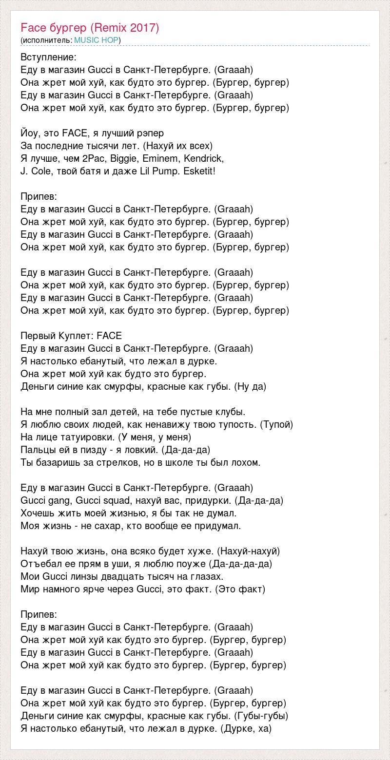 Вступление: Еду в магазин Gucci в Санкт-Петербурге. (Graaah) Она жрет мой хуй, как будто это бургер. (Бургер, бургер) Еду в магазин Gucci в Санкт-Петербурге. (Graaah) Она жрет мой хуй, как будто это бургер. (Бургер, бургер) Йоу, это FACE, я лучший рэпер За последние тысячи лет. (Нахуй их всех) Я лучше, чем 2Pac, Biggie, Eminem, Kendrick, J. Cole, твой батя и даже Lil Pump. Esketit! Припев: Еду в магазин Gucci в Санкт-Петербурге. (Graaah) Она жрет мой хуй, как будто это бургер. (Бургер, бургер) Еду в магазин Gucci в Санкт-Петербурге. (Graaah) Она жрет мой хуй, как будто это бургер. (Бургер, бургер) Еду в магазин Gucci в Санкт-Петербурге. (Graaah) Она жрет мой хуй, как будто это бургер. (Бургер, бургер) Еду в магазин Gucci в Санкт-Петербурге. (Graaah) Она жрет мой хуй, как будто это бургер. (Бургер, бургер) Первый Куплет: FACE Еду в магазин Gucci в Санкт-Петербурге. (Graaah) Я настолько ебанутый, что лежал в дурке. Она жрет мой хуй как будто это бургер. Деньги синие как смурфы, красные как губы. (Ну да) На мне полный зал детей, на тебе пустые клубы. Я люблю своих людей, как ненавижу твою тупость. (Тупой) На лице татуировки. (У меня, у меня) Пальцы ей в пизду - я ловкий. (Да-да-да) Ты базаришь за стрелков, но в школе ты был лохом. Еду в магазин Gucci в Санкт-Петербурге. (Graaah) Gucci gang, Gucci squad, нахуй вас, придурки. (Да-да-да) Хочешь жить моей жизнью, я бы так не думал. Моя жизнь - не сахар, кто вообще ее придумал. Нахуй твою жизнь, она всяко будет хуже. (Нахуй-нахуй) Отъебал ее прям в уши, я люблю поуже (Да-да-да-да) Мои Gucci линзы двадцать тысяч на глазах. Мир намного ярче через Gucci, это факт. (Это факт) Припев: Еду в магазин Gucci в Санкт-Петербурге. (Graaah) Она жрет мой хуй как будто это бургер. (Бургер, бургер) Еду в магазин Gucci в Санкт-Петербурге. (Graaah) Она жрет мой хуй как будто это бургер. (Бургер, бургер) Еду в магазин Gucci в Санкт-Петербурге. (Graaah) Она жрет мой хуй как будто это бургер. (Бургер, бургер) Деньги синие как смурфы, красные как губы. (Губы-губы) Я настолько ебанутый, что лежал в дурке. (Дурке, ха)