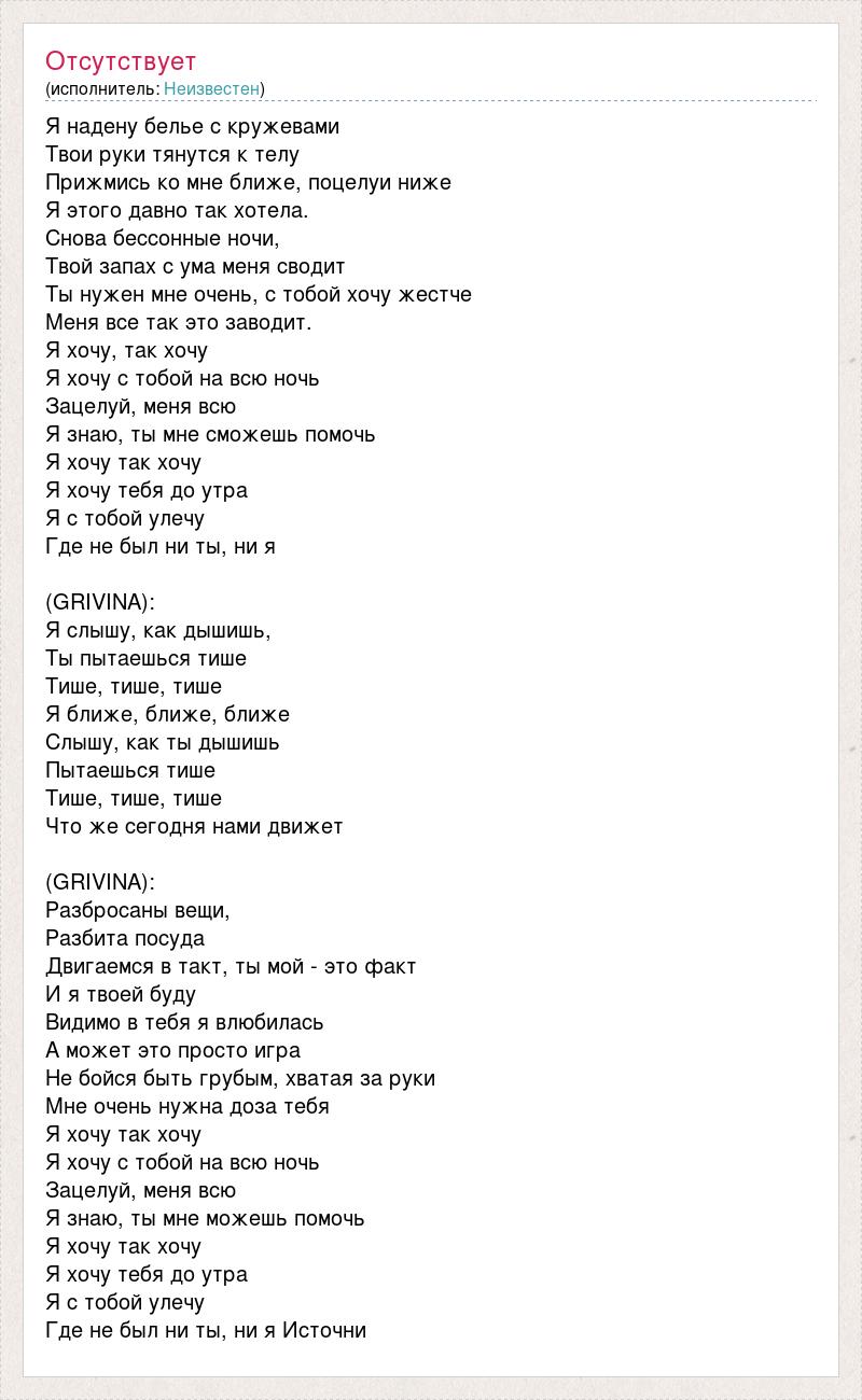 Я надену белье с кружевами Твои руки тянутся к телу Прижмись ко мне ближе, поцелуи ниже Я этого давно так хотела. Снова бессонные ночи, Твой запах с ума меня сводит Ты нужен мне очень, с тобой хочу жестче Меня все так это заводит. Я хочу, так хочу Я хочу с тобой на всю ночь Зацелуй, меня всю Я знаю, ты мне сможешь помочь Я хочу так хочу Я хочу тебя до утра Я с тобой улечу Где не был ни ты, ни я (GRIVINA): Я слышу, как дышишь, Ты пытаешься тише Тише, тише, тише Я ближе, ближе, ближе Слышу, как ты дышишь Пытаешься тише Тише, тише, тише Что же сегодня нами движет (GRIVINA): Разбросаны вещи, Разбита посуда Двигаемся в такт, ты мой - это факт И я твоей буду Видимо в тебя я влюбилась А может это просто игра Не бойся быть грубым, хватая за руки Мне очень нужна доза тебя Я хочу так хочу Я хочу с тобой на всю ночь Зацелуй, меня всю Я знаю, ты мне можешь помочь Я хочу так хочу Я хочу тебя до утра Я с тобой улечу Где не был ни ты, ни я Источни