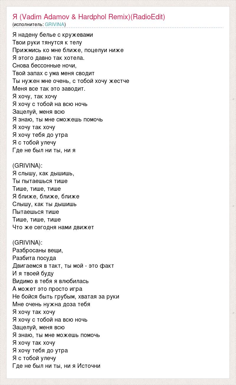 Я надену белье с кружевами Твои руки тянутся к телу Прижмись ко мне ближе, поцелуи ниже Я этого давно так хотела. Снова бессонные ночи, Твой запах с ума меня сводит Ты нужен мне очень, с тобой хочу жестче Меня все так это заводит. Я хочу, так хочу Я хочу с тобой на всю ночь Зацелуй, меня всю Я знаю, ты мне сможешь помочь Я хочу так хочу Я хочу тебя до утра Я с тобой улечу Где не был ни ты, ни я (GRIVINA): Я слышу, как дышишь, Ты пытаешься тише Тише, тише, тише Я ближе, ближе, ближе Слышу, как ты дышишь Пытаешься тише Тише, тише, тише Что же сегодня нами движет (GRIVINA): Разбросаны вещи, Разбита посуда Двигаемся в такт, ты мой - это факт И я твоей буду Видимо в тебя я влюбилась А может это просто игра Не бойся быть грубым, хватая за руки Мне очень нужна доза тебя Я хочу так хочу Я хочу с тобой на всю ночь Зацелуй, меня всю Я знаю, ты мне можешь помочь Я хочу так хочу Я хочу тебя до утра Я с тобой улечу Где не был ни ты, ни я Источни