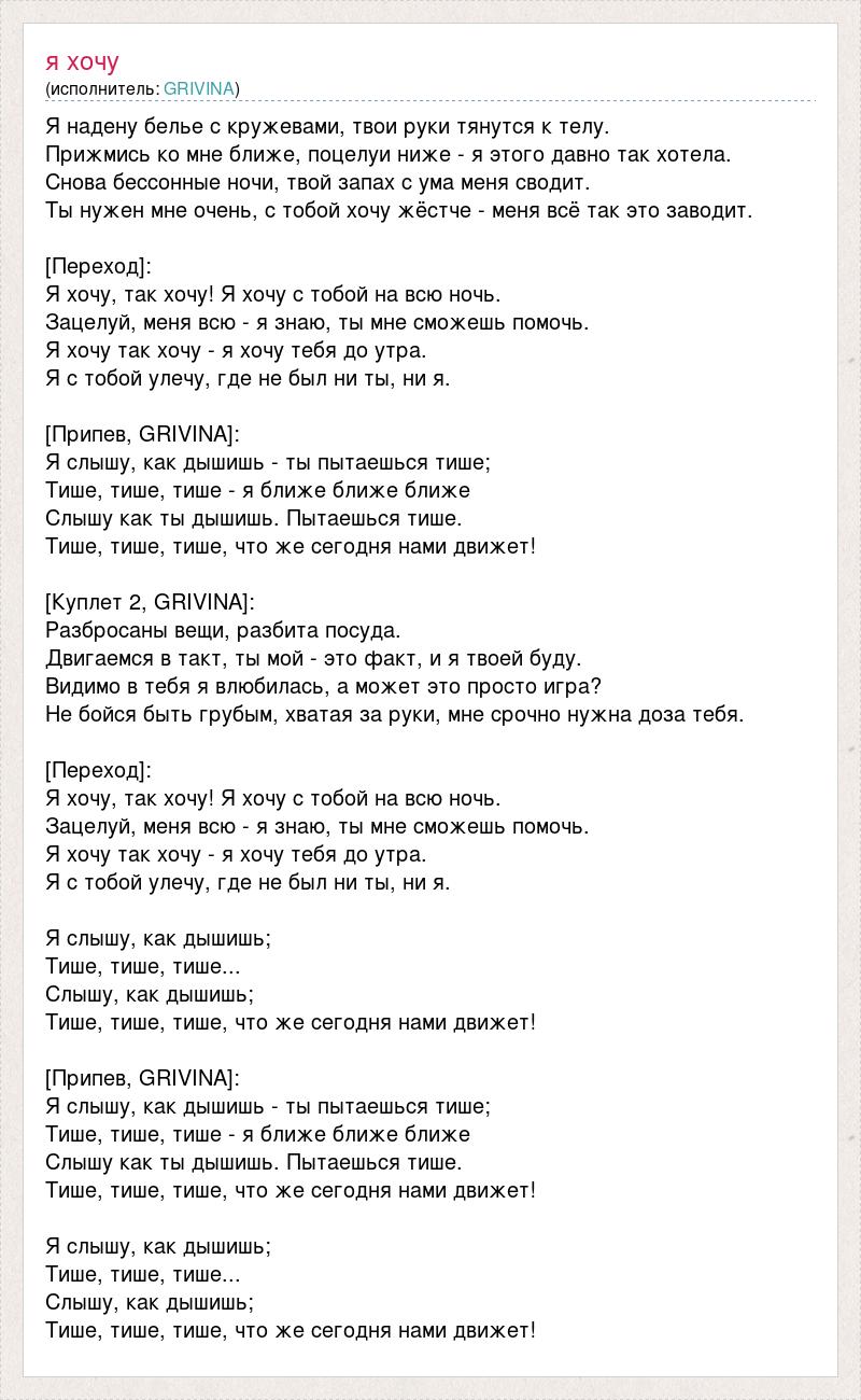 Я надену белье с кружевами, твои руки тянутся к телу. Прижмись ко мне ближе, поцелуи ниже - я этого давно так хотела. Снова бессонные ночи, твой запах с ума меня сводит. Ты нужен мне очень, с тобой хочу жёстче - меня всё так это заводит. [Переход]: Я хочу, так хочу! Я хочу с тобой на всю ночь. Зацелуй, меня всю - я знаю, ты мне сможешь помочь. Я хочу так хочу - я хочу тебя до утра. Я с тобой улечу, где не был ни ты, ни я. [Припев, GRIVINA]: Я слышу, как дышишь - ты пытаешься тише; Тише, тише, тише - я ближе ближе ближе Слышу как ты дышишь. Пытаешься тише. Тише, тише, тише, что же сегодня нами движет! [Куплет 2, GRIVINA]: Разбросаны вещи, разбита посуда. Двигаемся в такт, ты мой - это факт, и я твоей буду. Видимо в тебя я влюбилась, а может это просто игра? Не бойся быть грубым, хватая за руки, мне срочно нужна доза тебя. [Переход]: Я хочу, так хочу! Я хочу с тобой на всю ночь. Зацелуй, меня всю - я знаю, ты мне сможешь помочь. Я хочу так хочу - я хочу тебя до утра. Я с тобой улечу, где не был ни ты, ни я. Я слышу, как дышишь; Тише, тише, тише... Слышу, как дышишь; Тише, тише, тише, что же сегодня нами движет! [Припев, GRIVINA]: Я слышу, как дышишь - ты пытаешься тише; Тише, тише, тише - я ближе ближе ближе Слышу как ты дышишь. Пытаешься тише. Тише, тише, тише, что же сегодня нами движет! Я слышу, как дышишь; Тише, тише, тише... Слышу, как дышишь; Тише, тише, тише, что же сегодня нами движет!