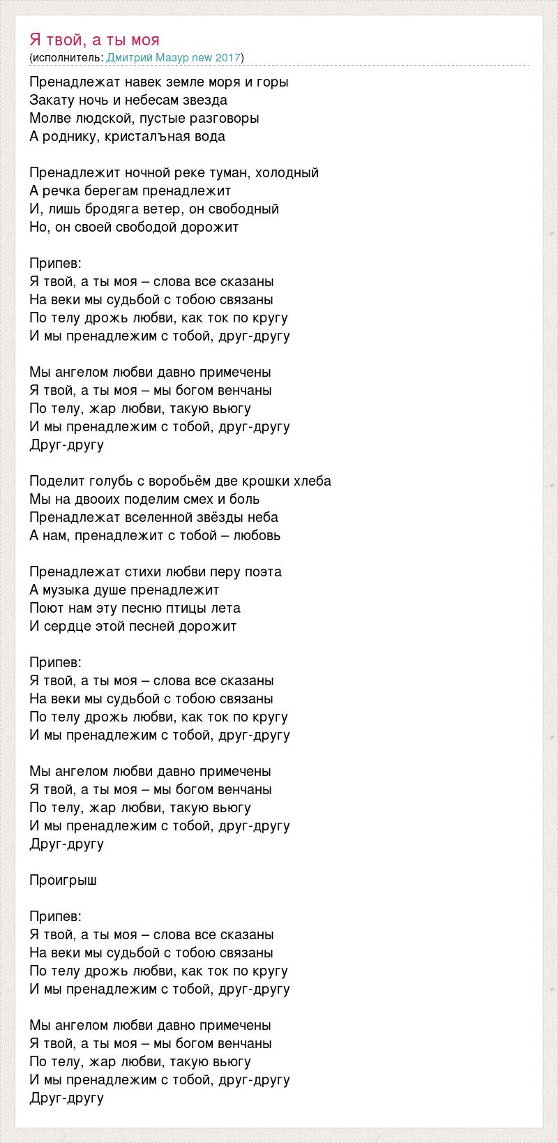 Пренадлежат навек земле моря и горы Закату ночь и небесам звезда Молве людской, пустые разговоры А роднику, кристалъная вода Пренадлежит ночной реке туман, холодный А речка берегам пренадлежит И, лишь бродяга ветер, он свободный Но, он своей свободой дорожит Припев: Я твой, а ты моя – слова все сказаны На веки мы судьбой с тобою связаны По телу дрожь любви, как ток по кругу И мы пренадлежим с тобой, друг-другу Мы ангелом любви давно примечены Я твой, а ты моя – мы богом венчаны По телу, жар любви, такую вьюгу И мы пренадлежим с тобой, друг-другу Друг-другу Поделит голубь с воробьём две крошки хлеба Мы на двооих поделим смех и боль Пренадлежат вселенной звёзды неба А нам, пренадлежит с тобой – любовь Пренадлежат стихи любви перу поэта А музыка душе пренадлежит Поют нам эту песню птицы лета И сердце этой песней дорожит Припев: Я твой, а ты моя – слова все сказаны На веки мы судьбой с тобою связаны По телу дрожь любви, как ток по кругу И мы пренадлежим с тобой, друг-другу Мы ангелом любви давно примечены Я твой, а ты моя – мы богом венчаны По телу, жар любви, такую вьюгу И мы пренадлежим с тобой, друг-другу Друг-другу Проигрыш Припев: Я твой, а ты моя – слова все сказаны На веки мы судьбой с тобою связаны По телу дрожь любви, как ток по кругу И мы пренадлежим с тобой, друг-другу Мы ангелом любви давно примечены Я твой, а ты моя – мы богом венчаны По телу, жар любви, такую вьюгу И мы пренадлежим с тобой, друг-другу Друг-другу