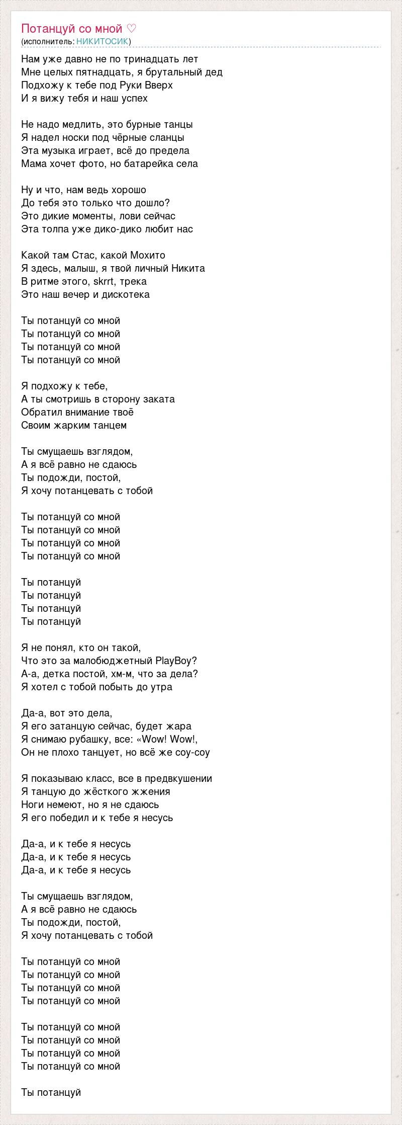 Нам уже давно не по тринадцать лет Мне целых пятнадцать, я брутальный дед Подхожу к тебе под Руки Вверх И я вижу тебя и наш успех Не надо медлить, это бурные танцы Я надел носки под чёрные сланцы Эта музыка играет, всё до предела Мама хочет фото, но батарейка села Ну и что, нам ведь хорошо До тебя это только что дошло? Это дикие моменты, лови сейчас Эта толпа уже дико-дико любит нас Какой там Стас, какой Мохито Я здесь, малыш, я твой личный Никита В ритме этого, skrrt, трека Это наш вечер и дискотека Ты потанцуй со мной Ты потанцуй со мной Ты потанцуй со мной Ты потанцуй со мной Я подхожу к тебе, А ты смотришь в сторону заката Обратил внимание твоё Своим жарким танцем Ты смущаешь взглядом, А я всё равно не сдаюсь Ты подожди, постой, Я хочу потанцевать с тобой Ты потанцуй со мной Ты потанцуй со мной Ты потанцуй со мной Ты потанцуй со мной Ты потанцуй Ты потанцуй Ты потанцуй Ты потанцуй Я не понял, кто он такой, Что это за малобюджетный PlayBoy? А-а, детка постой, хм-м, что за дела? Я хотел с тобой побыть до утра Да-а, вот это дела, Я его затанцую сейчас, будет жара Я снимаю рубашку, все: «Wow! Wow!, Он не плохо танцует, но всё же соу-соу Я показываю класс, все в предвкушении Я танцую до жёсткого жжения Ноги немеют, но я не сдаюсь Я его победил и к тебе я несусь Да-а, и к тебе я несусь Да-а, и к тебе я несусь Да-а, и к тебе я несусь Ты смущаешь взглядом, А я всё равно не сдаюсь Ты подожди, постой, Я хочу потанцевать с тобой Ты потанцуй со мной Ты потанцуй со мной Ты потанцуй со мной Ты потанцуй со мной Ты потанцуй со мной Ты потанцуй со мной Ты потанцуй со мной Ты потанцуй со мной Ты потанцуй