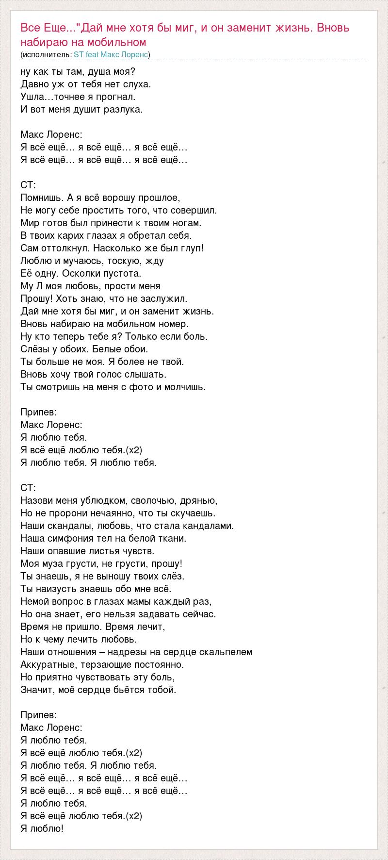 ну как ты там, душа моя? Давно уж от тебя нет слуха. Ушла…точнее я прогнал. И вот меня душит разлука. Макс Лоренс: Я всё ещё… я всё ещё… я всё ещё… Я всё ещё… я всё ещё… я всё ещё… СТ: Помнишь. А я всё ворошу прошлое, Не могу себе простить того, что совершил. Мир готов был принести к твоим ногам. В твоих карих глазах я обретал себя. Сам оттолкнул. Насколько же был глуп! Люблю и мучаюсь, тоскую, жду Её одну. Осколки пустота. Му Л моя любовь, прости меня Прошу! Хоть знаю, что не заслужил. Дай мне хотя бы миг, и он заменит жизнь. Вновь набираю на мобильном номер. Ну кто теперь тебе я? Только если боль. Слёзы у обоих. Белые обои. Ты больше не моя. Я более не твой. Вновь хочу твой голос слышать. Ты смотришь на меня с фото и молчишь. Припев: Макс Лоренс: Я люблю тебя. Я всё ещё люблю тебя.(х2) Я люблю тебя. Я люблю тебя. СТ: Назови меня ублюдком, сволочью, дрянью, Но не пророни нечаянно, что ты скучаешь. Наши скандалы, любовь, что стала кандалами. Наша симфония тел на белой ткани. Наши опавшие листья чувств. Моя муза грусти, не грусти, прошу! Ты знаешь, я не выношу твоих слёз. Ты наизусть знаешь обо мне всё. Немой вопрос в глазах мамы каждый раз, Но она знает, его нельзя задавать сейчас. Время не пришло. Время лечит, Но к чему лечить любовь. Наши отношения – надрезы на сердце скальпелем Аккуратные, терзающие постоянно. Но приятно чувствовать эту боль, Значит, моё сердце бьётся тобой. Припев: Макс Лоренс: Я люблю тебя. Я всё ещё люблю тебя.(х2) Я люблю тебя. Я люблю тебя. Я всё ещё… я всё ещё… я всё ещё… Я всё ещё… я всё ещё… я всё ещё… Я люблю тебя. Я всё ещё люблю тебя.(х2) Я люблю!