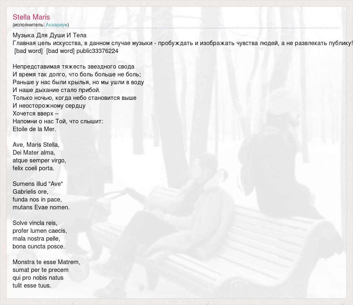 Музыка Для Души И Тела Главная цель искусства, в данном случае музыки - пробуждать и изображать чувства людей, а не развлекать публику! [bad word] [bad word] public33376224 Непредставимая тяжесть звездного свода И время так долго, что боль больше не боль; Раньше у нас были крылья, но мы ушли в воду И наше дыхание стало прибой. Только ночью, когда небо становится выше И неосторожному сердцу Хочется вверх – Напомни о нас Той, что слышит: Etoile de la Mer. Ave, Maris Stella, Dei Mater alma, atque semper virgo, felix coeli porta. Sumens illud "Ave" Gabrielis ore, funda nos in pace, mutans Evae nomen. Solve vincla reis, profer lumen caecis, mala nostra pelle, bona cuncta posce. Monstra te esse Matrem, sumat per te precem qui pro nobis natus tulit esse tuus.