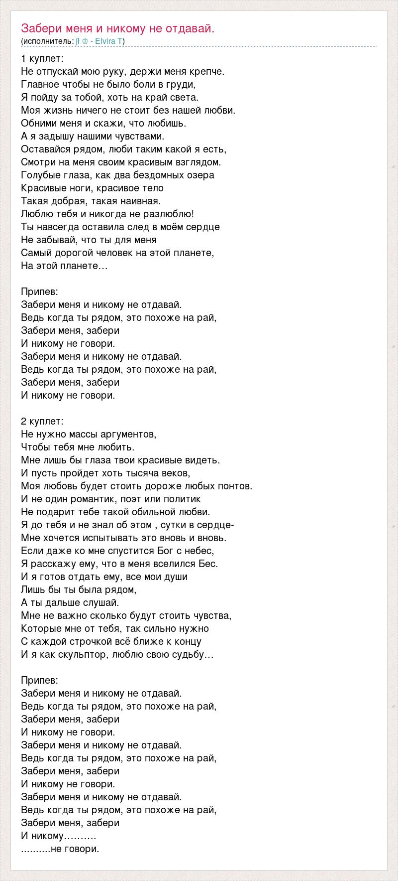 1 куплет: Не отпускай мою руку, держи меня крепче. Главное чтобы не было боли в груди, Я пойду за тобой, хоть на край света. Моя жизнь ничего не стоит без нашей любви. Обними меня и скажи, что любишь. А я задышу нашими чувствами. Оставайся рядом, люби таким какой я есть, Смотри на меня своим красивым взглядом. Голубые глаза, как два бездомных озера Красивые ноги, красивое тело Такая добрая, такая наивная. Люблю тебя и никогда не разлюблю! Ты навсегда оставила след в моём сердце Не забывай, что ты для меня Самый дорогой человек на этой планете, На этой планете… Припев: Забери меня и никому не отдавай. Ведь когда ты рядом, это похоже на рай, Забери меня, забери И никому не говори. Забери меня и никому не отдавай. Ведь когда ты рядом, это похоже на рай, Забери меня, забери И никому не говори. 2 куплет: Не нужно массы аргументов, Чтобы тебя мне любить. Мне лишь бы глаза твои красивые видеть. И пусть пройдет хоть тысяча веков, Моя любовь будет стоить дороже любых понтов. И не один романтик, поэт или политик Не подарит тебе такой обильной любви. Я до тебя и не знал об этом , сутки в сердце- Мне хочется испытывать это вновь и вновь. Если даже ко мне спустится Бог с небес, Я расскажу ему, что в меня вселился Бес. И я готов отдать ему, все мои души Лишь бы ты была рядом, А ты дальше слушай. Мне не важно сколько будут стоить чувства, Которые мне от тебя, так сильно нужно С каждой строчкой всё ближе к концу И я как скульптор, люблю свою судьбу… Припев: Забери меня и никому не отдавай. Ведь когда ты рядом, это похоже на рай, Забери меня, забери И никому не говори. Забери меня и никому не отдавай. Ведь когда ты рядом, это похоже на рай, Забери меня, забери И никому не говори. Забери меня и никому не отдавай. Ведь когда ты рядом, это похоже на рай, Забери меня, забери И никому………. ..........не говори.