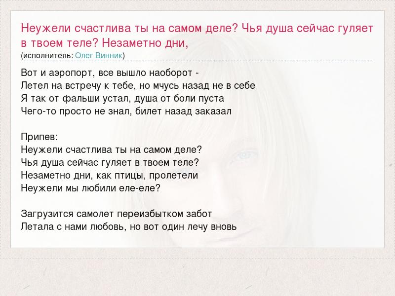 Вот и аэропорт, все вышло наоборот - Летел на встречу к тебе, но мчусь назад не в себе Я так от фальши устал, душа от боли пуста Чего-то просто не знал, билет назад заказал Припев: Неужели счастлива ты на самом деле? Чья душа сейчас гуляет в твоем теле? Незаметно дни, как птицы, пролетели Неужели мы любили еле-еле? Загрузится самолет переизбытком забот Летала с нами любовь, но вот один лечу вновь