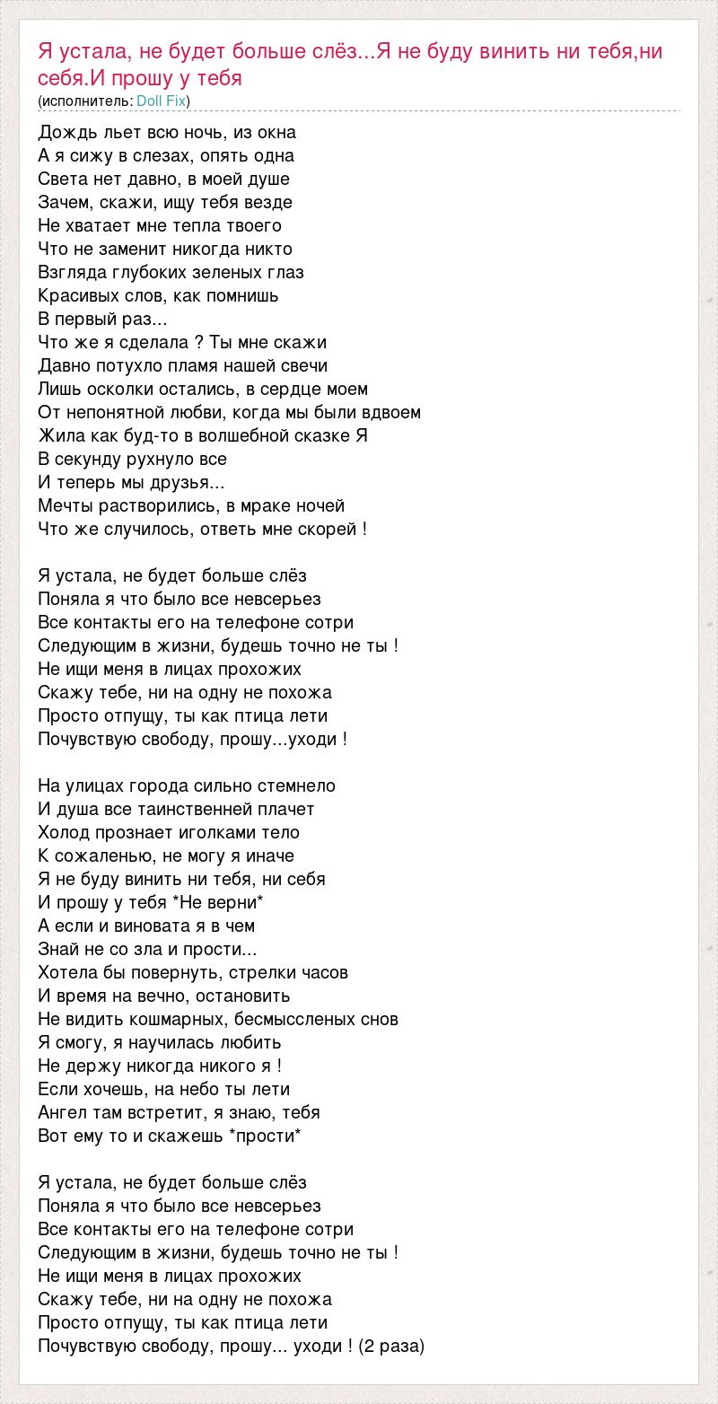 Дождь льет всю ночь, из окна А я сижу в слезах, опять одна Света нет давно, в моей душе Зачем, скажи, ищу тебя везде Не хватает мне тепла твоего Что не заменит никогда никто Взгляда глубоких зеленых глаз Красивых слов, как помнишь В первый раз... Что же я сделала ? Ты мне скажи Давно потухло пламя нашей свечи Лишь осколки остались, в сердце моем От непонятной любви, когда мы были вдвоем Жила как буд-то в волшебной сказке Я В секунду рухнуло все И теперь мы друзья... Мечты растворились, в мраке ночей Что же случилось, ответь мне скорей ! Я устала, не будет больше слёз Поняла я что было все невсерьез Все контакты его на телефоне сотри Следующим в жизни, будешь точно не ты ! Не ищи меня в лицах прохожих Скажу тебе, ни на одну не похожа Просто отпущу, ты как птица лети Почувствую свободу, прошу...уходи ! На улицах города сильно стемнело И душа все таинственней плачет Холод прознает иголками тело К сожаленью, не могу я иначе Я не буду винить ни тебя, ни себя И прошу у тебя *Не верни* А если и виновата я в чем Знай не со зла и прости... Хотела бы повернуть, стрелки часов И время на вечно, остановить Не видить кошмарных, бесмыссленых снов Я смогу, я научилась любить Не держу никогда никого я ! Если хочешь, на небо ты лети Ангел там встретит, я знаю, тебя Вот ему то и скажешь *прости* Я устала, не будет больше слёз Поняла я что было все невсерьез Все контакты его на телефоне сотри Следующим в жизни, будешь точно не ты ! Не ищи меня в лицах прохожих Скажу тебе, ни на одну не похожа Просто отпущу, ты как птица лети Почувствую свободу, прошу... уходи ! (2 раза)