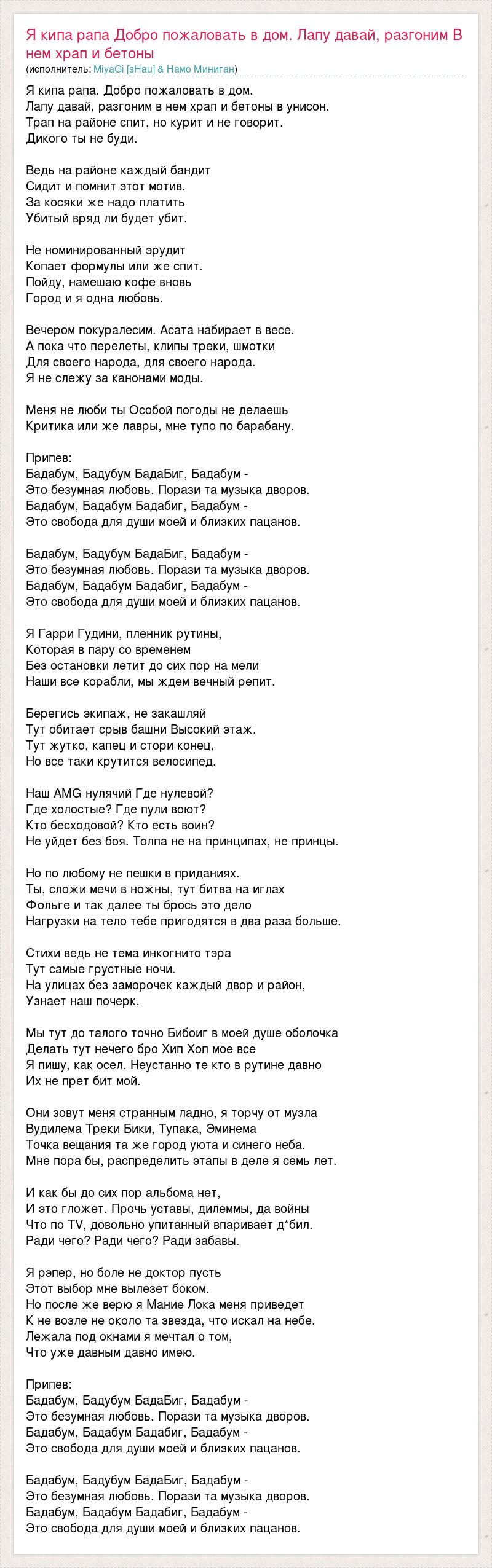 Я кипа рапа. Добро пожаловать в дом. Лапу давай, разгоним в нем храп и бетоны в унисон. Трап на районе спит, но курит и не говорит. Дикого ты не буди. Ведь на районе каждый бандит Сидит и помнит этот мотив. За косяки же надо платить Убитый вряд ли будет убит. Не номинированный эрудит Копает формулы или же спит. Пойду, намешаю кофе вновь Город и я одна любовь. Вечером покуралесим. Асата набирает в весе. А пока что перелеты, клипы треки, шмотки Для своего народа, для своего народа. Я не слежу за канонами моды. Меня не люби ты Особой погоды не делаешь Критика или же лавры, мне тупо по барабану. Припев: Бадабум, Бадубум БадаБиг, Бадабум - Это безумная любовь. Порази та музыка дворов. Бадабум, Бадабум Бадабиг, Бадабум - Это свобода для души моей и близких пацанов. Бадабум, Бадубум БадаБиг, Бадабум - Это безумная любовь. Порази та музыка дворов. Бадабум, Бадабум Бадабиг, Бадабум - Это свобода для души моей и близких пацанов. Я Гарри Гудини, пленник рутины, Которая в пару со временем Без остановки летит до сих пор на мели Наши все корабли, мы ждем вечный репит. Берегись экипаж, не закашляй Тут обитает срыв башни Высокий этаж. Тут жутко, капец и стори конец, Но все таки крутится велосипед. Наш AMG нулячий Где нулевой? Где холостые? Где пули воют? Кто бесходовой? Кто есть воин? Не уйдет без боя. Толпа не на принципах, не принцы. Но по любому не пешки в приданиях. Ты, сложи мечи в ножны, тут битва на иглах Фольге и так далее ты брось это дело Нагрузки на тело тебе пригодятся в два раза больше. Стихи ведь не тема инкогнито тэра Тут самые грустные ночи. На улицах без заморочек каждый двор и район, Узнает наш почерк. Мы тут до талого точно Бибоиг в моей душе оболочка Делать тут нечего бро Хип Хоп мое все Я пишу, как осел. Неустанно те кто в рутине давно Их не прет бит мой. Они зовут меня странным ладно, я торчу от музла Вудилема Треки Бики, Тупака, Эминема Точка вещания та же город уюта и синего неба. Мне пора бы, распределить этапы в деле я семь лет. И как бы до сих пор альбома нет, И это гложет. Прочь уставы, дилеммы, да войны Что по TV, довольно упитанный впаривает д*бил. Ради чего? Ради чего? Ради забавы. Я рэпер, но боле не доктор пусть Этот выбор мне вылезет боком. Но после же верю я Мание Лока меня приведет К не возле не около та звезда, что искал на небе. Лежала под окнами я мечтал о том, Что уже давным давно имею. Припев: Бадабум, Бадубум БадаБиг, Бадабум - Это безумная любовь. Порази та музыка дворов. Бадабум, Бадабум Бадабиг, Бадабум - Это свобода для души моей и близких пацанов. Бадабум, Бадубум БадаБиг, Бадабум - Это безумная любовь. Порази та музыка дворов. Бадабум, Бадабум Бадабиг, Бадабум - Это свобода для души моей и близких пацанов.