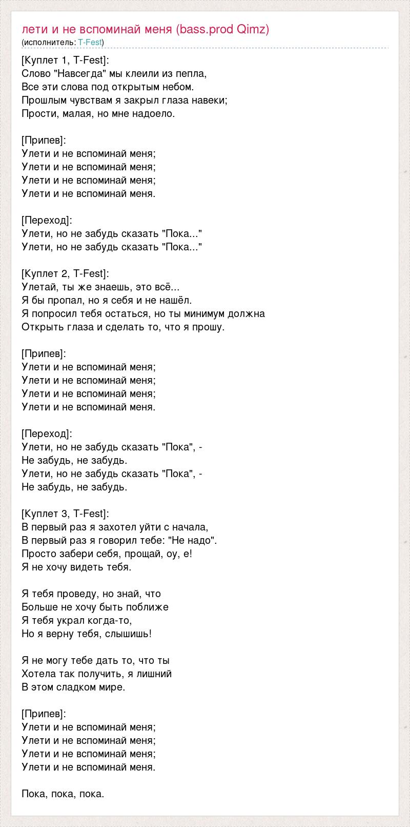 [Куплет 1, T-Fest]: Слово "Навсегда" мы клеили из пепла, Все эти слова под открытым небом. Прошлым чувствам я закрыл глаза навеки; Прости, малая, но мне надоело. [Припев]: Улети и не вспоминай меня; Улети и не вспоминай меня; Улети и не вспоминай меня; Улети и не вспоминай меня. [Переход]: Улети, но не забудь сказать "Пока..." Улети, но не забудь сказать "Пока..." [Куплет 2, T-Fest]: Улетай, ты же знаешь, это всё... Я бы пропал, но я себя и не нашёл. Я попросил тебя остаться, но ты минимум должна Открыть глаза и сделать то, что я прошу. [Припев]: Улети и не вспоминай меня; Улети и не вспоминай меня; Улети и не вспоминай меня; Улети и не вспоминай меня. [Переход]: Улети, но не забудь сказать "Пока", - Не забудь, не забудь. Улети, но не забудь сказать "Пока", - Не забудь, не забудь. [Куплет 3, T-Fest]: В первый раз я захотел уйти с начала, В первый раз я говорил тебе: "Не надо". Просто забери себя, прощай, оу, е! Я не хочу видеть тебя. Я тебя проведу, но знай, что Больше не хочу быть поближе Я тебя украл когда-то, Но я верну тебя, слышишь! Я не могу тебе дать то, что ты Хотела так получить, я лишний В этом сладком мире. [Припев]: Улети и не вспоминай меня; Улети и не вспоминай меня; Улети и не вспоминай меня; Улети и не вспоминай меня. Пока, пока, пока.