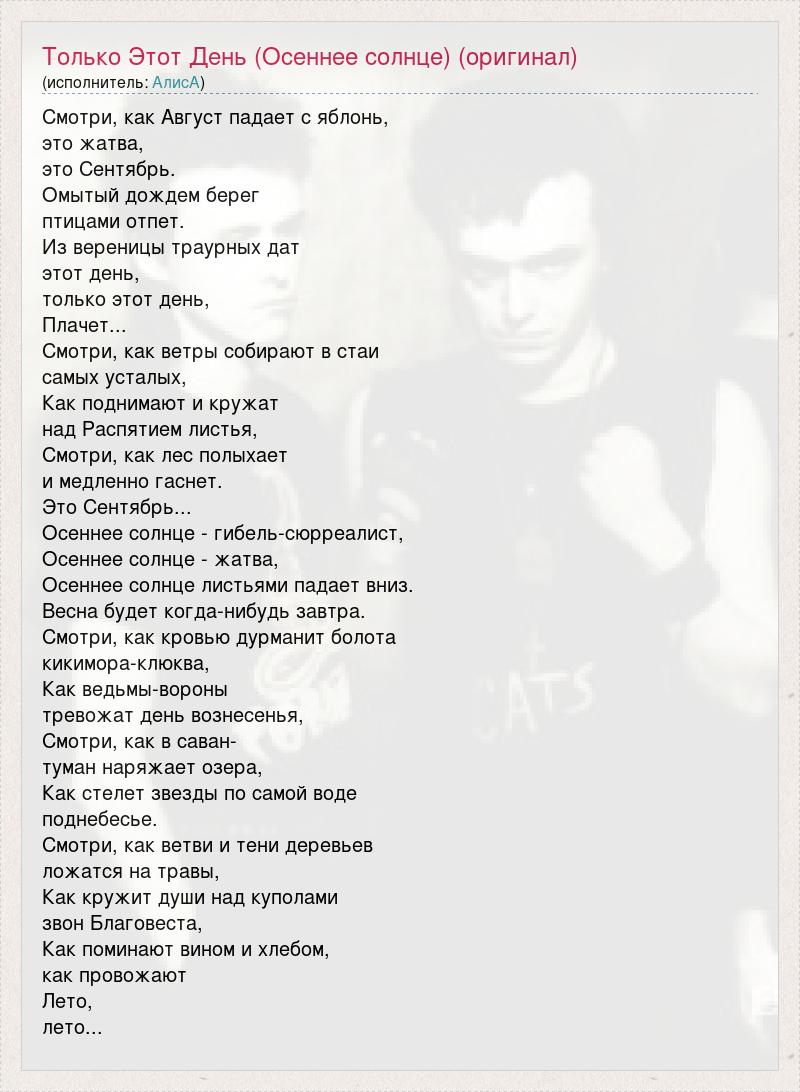Смотри, как Август падает с яблонь, это жатва, это Сентябрь. Омытый дождем берег птицами отпет. Из вереницы траурных дат этот день, только этот день, Плачет... Смотри, как ветры собирают в стаи самых усталых, Как поднимают и кружат над Распятием листья, Смотри, как лес полыхает и медленно гаснет. Это Сентябрь... Осеннее солнце - гибель-сюрреалист, Осеннее солнце - жатва, Осеннее солнце листьями падает вниз. Весна будет когда-нибудь завтра. Смотри, как кровью дурманит болота кикимора-клюква, Как ведьмы-вороны тревожат день вознесенья, Смотри, как в саван- туман наряжает озера, Как стелет звезды по самой воде поднебесье. Смотри, как ветви и тени деревьев ложатся на травы, Как кружит души над куполами звон Благовеста, Как поминают вином и хлебом, как провожают Лето, лето...
