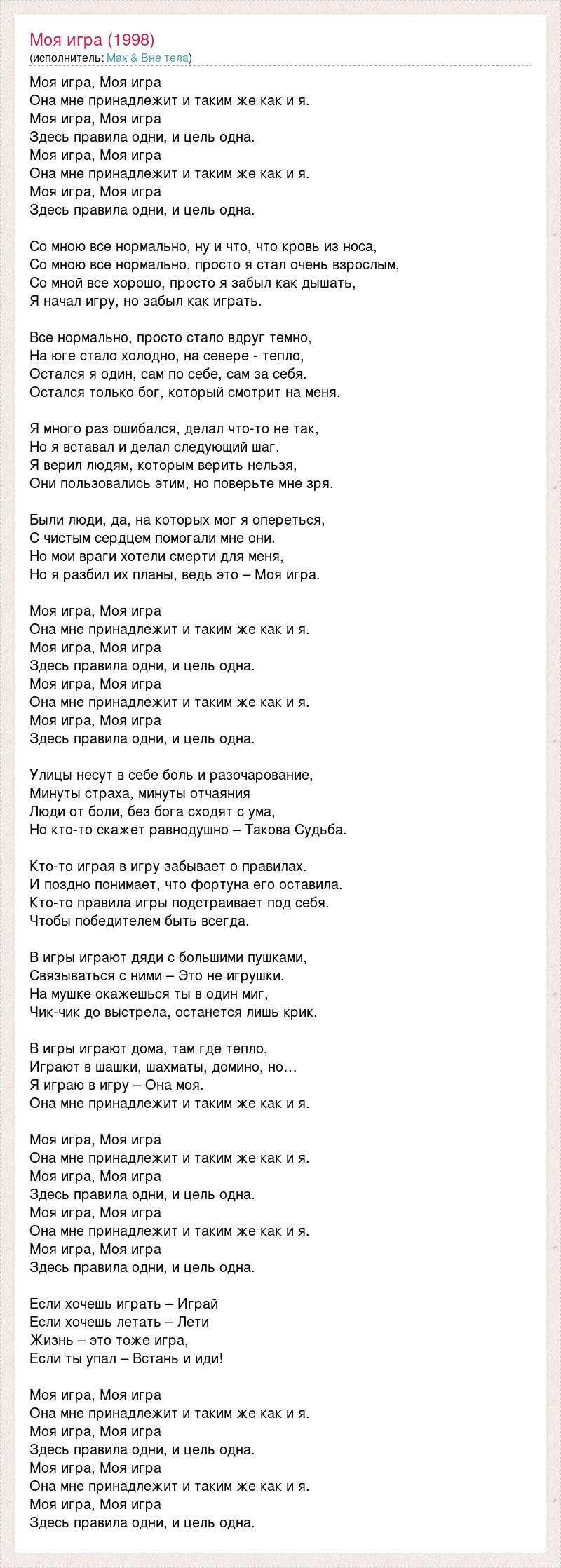 Моя игра, Моя игра Она мне принадлежит и таким же как и я. Моя игра, Моя игра Здесь правила одни, и цель одна. Моя игра, Моя игра Она мне принадлежит и таким же как и я. Моя игра, Моя игра Здесь правила одни, и цель одна. Со мною все нормально, ну и что, что кровь из носа, Со мною все нормально, просто я стал очень взрослым, Со мной все хорошо, просто я забыл как дышать, Я начал игру, но забыл как играть. Все нормально, просто стало вдруг темно, На юге стало холодно, на севере - тепло, Остался я один, сам по себе, сам за себя. Остался только бог, который смотрит на меня. Я много раз ошибался, делал что-то не так, Но я вставал и делал следующий шаг. Я верил людям, которым верить нельзя, Они пользовались этим, но поверьте мне зря. Были люди, да, на которых мог я опереться, С чистым сердцем помогали мне они. Но мои враги хотели смерти для меня, Но я разбил их планы, ведь это – Моя игра. Моя игра, Моя игра Она мне принадлежит и таким же как и я. Моя игра, Моя игра Здесь правила одни, и цель одна. Моя игра, Моя игра Она мне принадлежит и таким же как и я. Моя игра, Моя игра Здесь правила одни, и цель одна. Улицы несут в себе боль и разочарование, Минуты страха, минуты отчаяния Люди от боли, без бога сходят с ума, Но кто-то скажет равнодушно – Такова Судьба. Кто-то играя в игру забывает о правилах. И поздно понимает, что фортуна его оставила. Кто-то правила игры подстраивает под себя. Чтобы победителем быть всегда. В игры играют дяди с большими пушками, Связываться с ними – Это не игрушки. На мушке окажешься ты в один миг, Чик-чик до выстрела, останется лишь крик. В игры играют дома, там где тепло, Играют в шашки, шахматы, домино, но… Я играю в игру – Она моя. Она мне принадлежит и таким же как и я. Моя игра, Моя игра Она мне принадлежит и таким же как и я. Моя игра, Моя игра Здесь правила одни, и цель одна. Моя игра, Моя игра Она мне принадлежит и таким же как и я. Моя игра, Моя игра Здесь правила одни, и цель одна. Если хочешь играть – Играй Если хочешь летать – Лети Жизнь – это тоже игра, Если ты упал – Встань и иди! Моя игра, Моя игра Она мне принадлежит и таким же как и я. Моя игра, Моя игра Здесь правила одни, и цель одна. Моя игра, Моя игра Она мне принадлежит и таким же как и я. Моя игра, Моя игра Здесь правила одни, и цель одна.