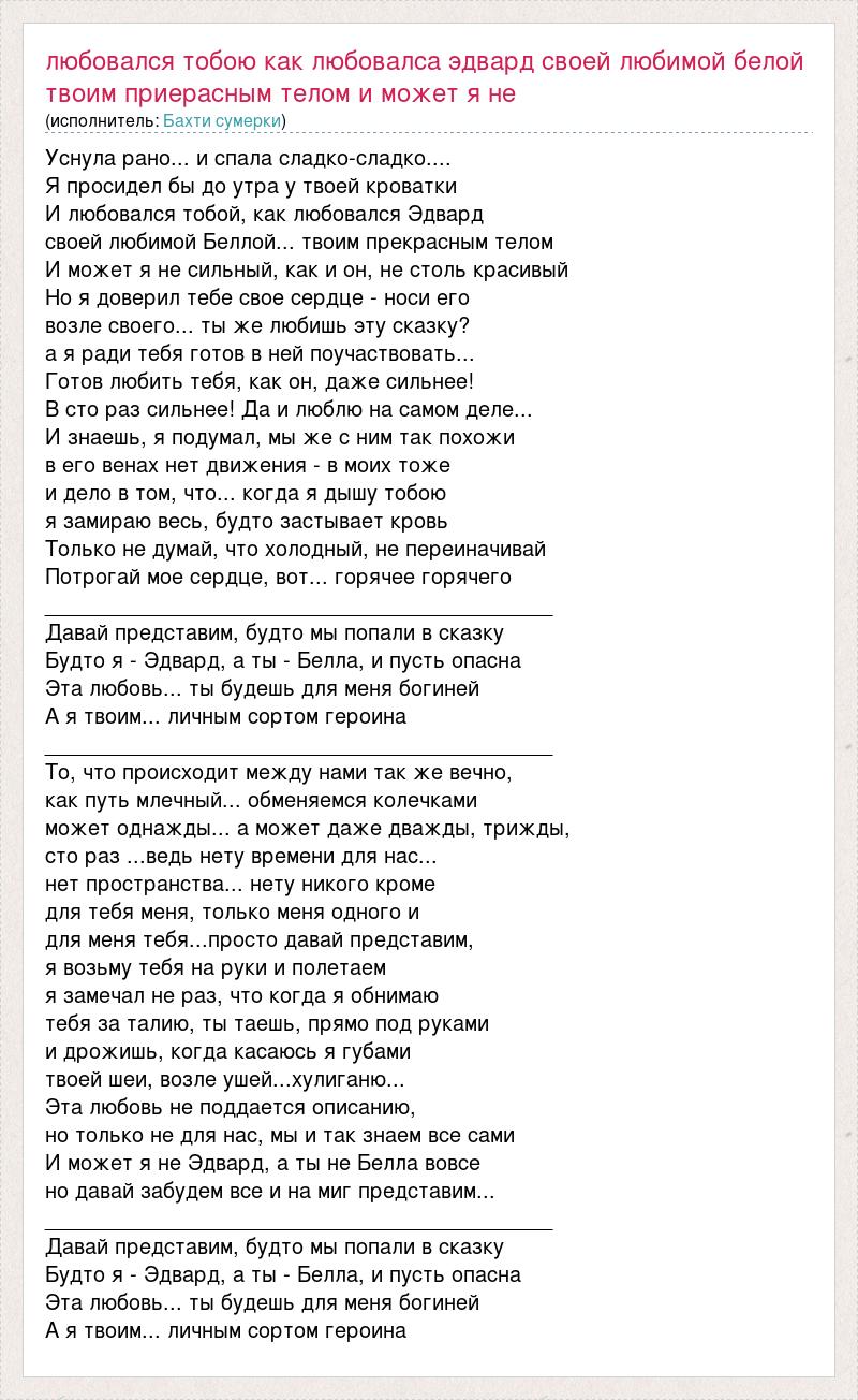 Уснула рано... и спала сладко-сладко.... Я просидел бы до утра у твоей кроватки И любовался тобой, как любовался Эдвард своей любимой Беллой... твоим прекрасным телом И может я не сильный, как и он, не столь красивый Но я доверил тебе свое сердце - носи его возле своего... ты же любишь эту сказку? а я ради тебя готов в ней поучаствовать... Готов любить тебя, как он, даже сильнее! В сто раз сильнее! Да и люблю на самом деле... И знаешь, я подумал, мы же с ним так похожи в его венах нет движения - в моих тоже и дело в том, что... когда я дышу тобою я замираю весь, будто застывает кровь Только не думай, что холодный, не переиначивай Потрогай мое сердце, вот... горячее горячего ___________________________________________ Давай представим, будто мы попали в сказку Будто я - Эдвард, а ты - Белла, и пусть опасна Эта любовь... ты будешь для меня богиней А я твоим... личным сортом героина ___________________________________________ То, что происходит между нами так же вечно, как путь млечный... обменяемся колечками может однажды... а может даже дважды, трижды, сто раз ...ведь нету времени для нас... нет пространства... нету никого кроме для тебя меня, только меня одного и для меня тебя...просто давай представим, я возьму тебя на руки и полетаем я замечал не раз, что когда я обнимаю тебя за талию, ты таешь, прямо под руками и дрожишь, когда касаюсь я губами твоей шеи, возле ушей...хулиганю... Эта любовь не поддается описанию, но только не для нас, мы и так знаем все сами И может я не Эдвард, а ты не Белла вовсе но давай забудем все и на миг представим... ___________________________________________ Давай представим, будто мы попали в сказку Будто я - Эдвард, а ты - Белла, и пусть опасна Эта любовь... ты будешь для меня богиней А я твоим... личным сортом героина