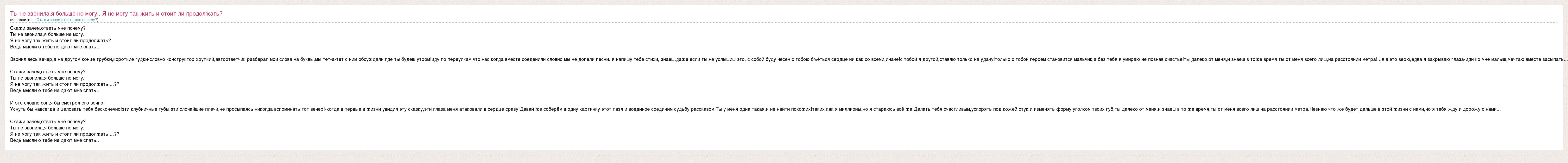 Скажи зачем,ответь мне почему? Ты не звонила,я больше не могу.. Я не могу так жить и стоит ли продолжать? Ведь мысли о тебе не дают мне спать.. Звонил весь вечер,а на другом конце трубки,короткие гудки-словно конструктор хрупкий,автоответчик разберал мои слова на буквы,мы тет-а-тет с ним обсуждали где ты будеш утром!иду по переулкам,что нас когда вместе соеденили словно мы не допели песни..я напишу тебе стихи, знаеш,даже если ты не услышиш это, с собой буду чесен!с тобою бъёться сердце ни как со всеми,иначе!с тобой я другой,ставлю только на удачу!только с тобой героем становится мальчик,а без тебя я умираю не познав счастье!ты далеко от меня,и знаеш в тоже время ты от меня всего лиш,на расстоянии метра!...я в это верю,едва я закрываю глаза-иди ко мне малыш,мечтаю вместе засыпать... Скажи зачем,ответь мне почему? Ты не звонила,я больше не могу.. Я не могу так жить и стоит ли продолжать ...?? Ведь мысли о тебе не дают мне спать.. И это словно сон,я бы смотрел его вечно! Уснуть бы навсегда и целовать тебя бесконечно!эти клубничные губы,эти слочайшие плечи,не просыпаясь никогда вспоминать тот вечер!-когда в первые в жизни увидил эту сказку,эти глаза меня атаковали в сердце сразу!Давай же соберём в одну картинку этот пазл и воединое соединим судьбу рассказом!Ты у меня одна такая,и не найти похожих!таких как я миллионы,но я стараюсь всё же!Делать тебя счастливым,ускорять под кожей стук,и изменять форму уголком твоих губ,ты далеко от меня,и знаеш в то же время,ты от меня всего лиш на расстоянии метра.Незнаю что же будет дальше в этой жизни с нами,но я тебя жду и дорожу с нами... Скажи зачем,ответь мне почему? Ты не звонила,я больше не могу.. Я не могу так жить и стоит ли продолжать ...?? Ведь мысли о тебе не дают мне спать..