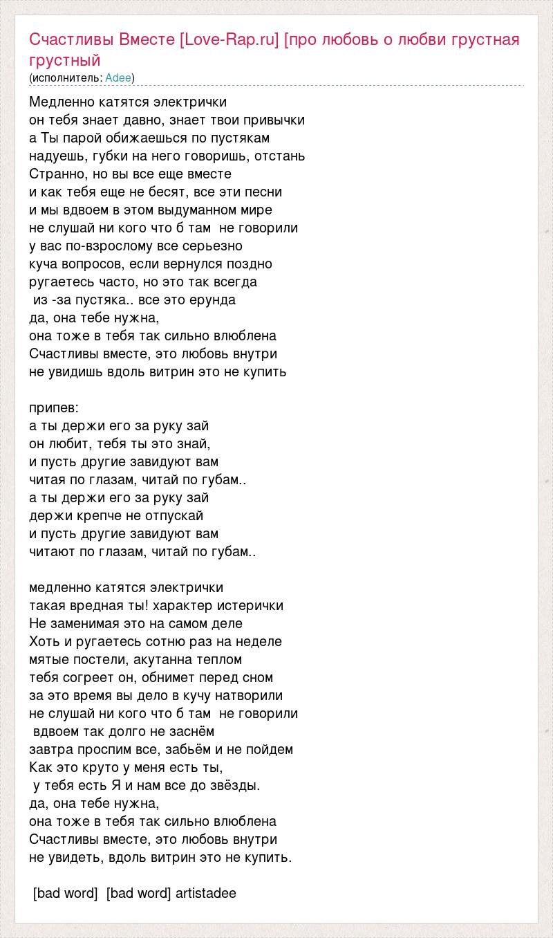 Медленно катятся электрички он тебя знает давно, знает твои привычки а Ты парой обижаешься по пустякам надуешь, губки на него говоришь, отстань Странно, но вы все еще вместе и как тебя еще не бесят, все эти песни и мы вдвоем в этом выдуманном мире не слушай ни кого что б там не говорили у вас по-взрослому все серьезно куча вопросов, если вернулся поздно ругаетесь часто, но это так всегда из -за пустяка.. все это ерунда да, она тебе нужна, она тоже в тебя так сильно влюблена Счастливы вместе, это любовь внутри не увидишь вдоль витрин это не купить припев: а ты держи его за руку зай он любит, тебя ты это знай, и пусть другие завидуют вам читая по глазам, читай по губам.. а ты держи его за руку зай держи крепче не отпускай и пусть другие завидуют вам читают по глазам, читай по губам.. медленно катятся электрички такая вредная ты! характер истерички Не заменимая это на самом деле Хоть и ругаетесь сотню раз на неделе мятые постели, акутанна теплом тебя согреет он, обнимет перед сном за это время вы дело в кучу натворили не слушай ни кого что б там не говорили вдвоем так долго не заснём завтра проспим все, забьём и не пойдем Как это круто у меня есть ты, у тебя есть Я и нам все до звёзды. да, она тебе нужна, она тоже в тебя так сильно влюблена Счастливы вместе, это любовь внутри не увидеть, вдоль витрин это не купить. [bad word] [bad word] artistadee