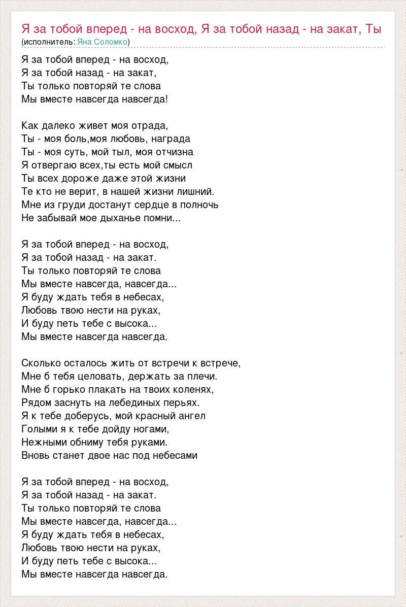 Я за тобой вперед - на восход, Я за тобой назад - на закат, Ты только повторяй те слова Мы вместе навсегда навсегда! Как далеко живет моя отрада, Ты - моя боль,моя любовь, награда Ты - моя суть, мой тыл, моя отчизна Я отвергаю всех,ты есть мой смысл Ты всех дороже даже этой жизни Те кто не верит, в нашей жизни лишний. Мне из груди достанут сердце в полночь Не забывай мое дыханье помни... Я за тобой вперед - на восход, Я за тобой назад - на закат. Ты только повторяй те слова Мы вместе навсегда, навсегда... Я буду ждать тебя в небесах, Любовь твою нести на руках, И буду петь тебе с высока... Мы вместе навсегда навсегда. Сколько осталось жить от встречи к встрече, Мне б тебя целовать, держать за плечи. Мне б горько плакать на твоих коленях, Рядом заснуть на лебединых перьях. Я к тебе доберусь, мой красный ангел Голыми я к тебе дойду ногами, Нежными обниму тебя руками. Вновь станет двое нас под небесами Я за тобой вперед - на восход, Я за тобой назад - на закат. Ты только повторяй те слова Мы вместе навсегда, навсегда... Я буду ждать тебя в небесах, Любовь твою нести на руках, И буду петь тебе с высока... Мы вместе навсегда навсегда.