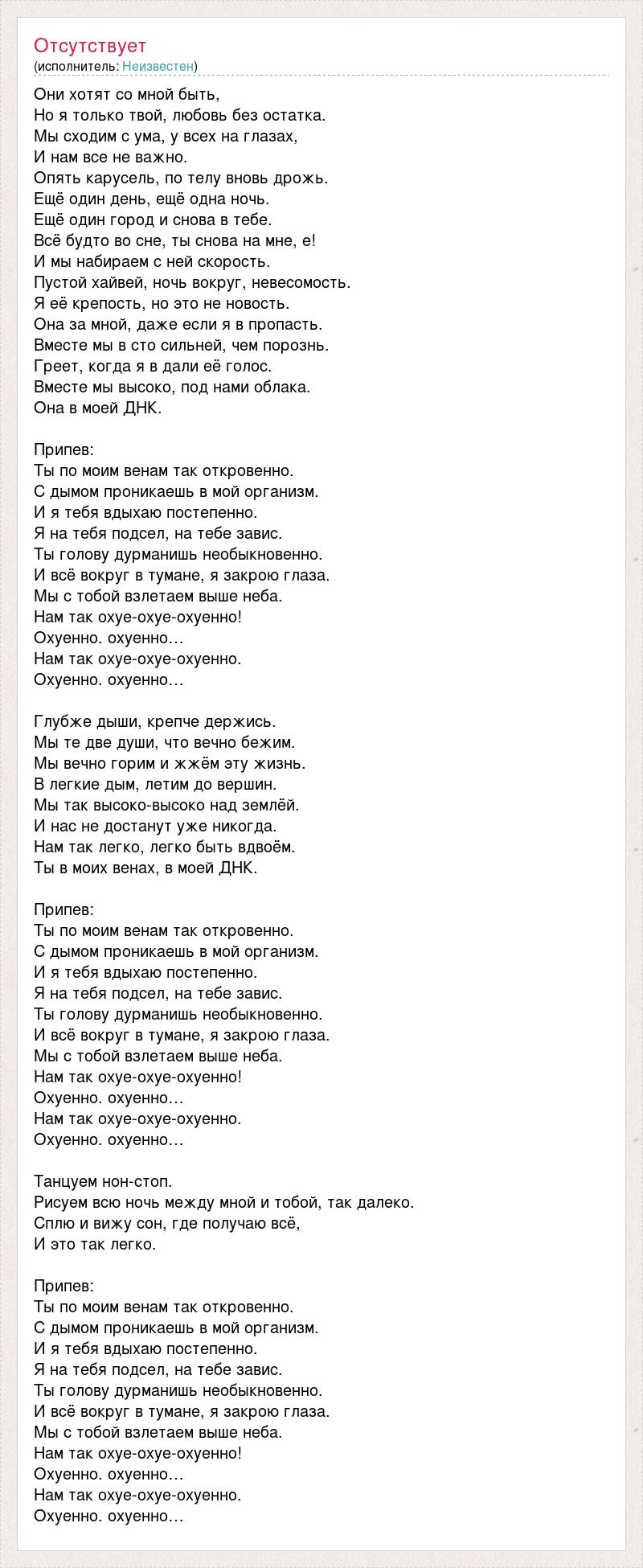 Они хотят со мной быть, Но я только твой, любовь без остатка. Мы сходим с ума, у всех на глазах, И нам все не важно. Опять карусель, по телу вновь дрожь. Ещё один день, ещё одна ночь. Ещё один город и снова в тебе. Всё будто во сне, ты снова на мне, е! И мы набираем с ней скорость. Пустой хайвей, ночь вокруг, невесомость. Я её крепость, но это не новость. Она за мной, даже если я в пропасть. Вместе мы в сто сильней, чем порознь. Греет, когда я в дали её голос. Вместе мы высоко, под нами облака. Она в моей ДНК. Припев: Ты по моим венам так откровенно. С дымом проникаешь в мой организм. И я тебя вдыхаю постепенно. Я на тебя подсел, на тебе завис. Ты голову дурманишь необыкновенно. И всё вокруг в тумане, я закрою глаза. Мы с тобой взлетаем выше неба. Нам так охуе-охуе-охуенно! Охуенно. охуенно… Нам так охуе-охуе-охуенно. Охуенно. охуенно… Глубже дыши, крепче держись. Мы те две души, что вечно бежим. Мы вечно горим и жжём эту жизнь. В легкие дым, летим до вершин. Мы так высоко-высоко над землёй. И нас не достанут уже никогда. Нам так легко, легко быть вдвоём. Ты в моих венах, в моей ДНК. Припев: Ты по моим венам так откровенно. С дымом проникаешь в мой организм. И я тебя вдыхаю постепенно. Я на тебя подсел, на тебе завис. Ты голову дурманишь необыкновенно. И всё вокруг в тумане, я закрою глаза. Мы с тобой взлетаем выше неба. Нам так охуе-охуе-охуенно! Охуенно. охуенно… Нам так охуе-охуе-охуенно. Охуенно. охуенно… Танцуем нон-стоп. Рисуем всю ночь между мной и тобой, так далеко. Сплю и вижу сон, где получаю всё, И это так легко. Припев: Ты по моим венам так откровенно. С дымом проникаешь в мой организм. И я тебя вдыхаю постепенно. Я на тебя подсел, на тебе завис. Ты голову дурманишь необыкновенно. И всё вокруг в тумане, я закрою глаза. Мы с тобой взлетаем выше неба. Нам так охуе-охуе-охуенно! Охуенно. охуенно… Нам так охуе-охуе-охуенно. Охуенно. охуенно…