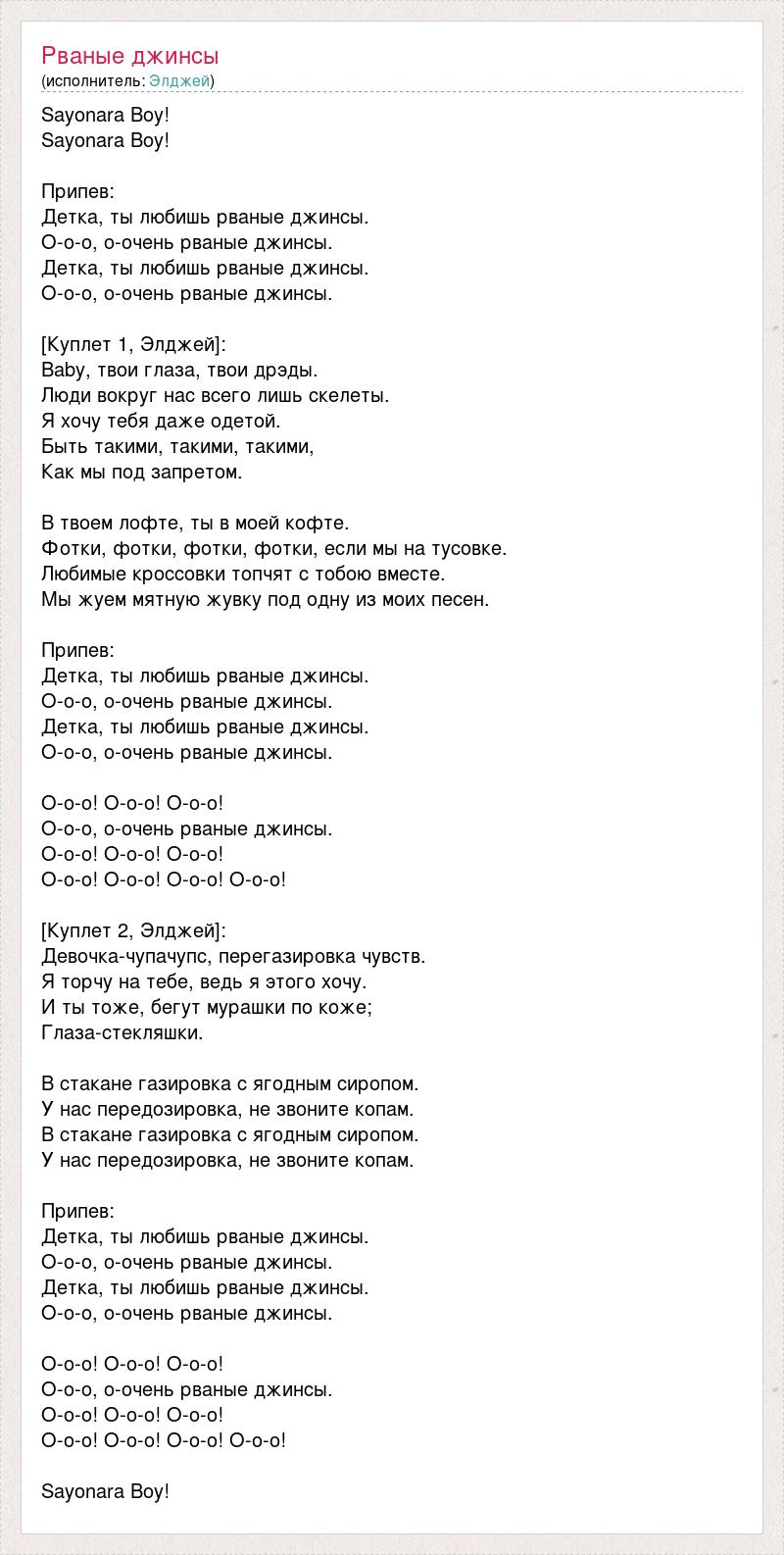 Sayonara Boy! Sayonara Boy! Припев: Детка, ты любишь рваные джинсы. О-о-о, о-очень рваные джинсы. Детка, ты любишь рваные джинсы. О-о-о, о-очень рваные джинсы. [Куплет 1, Элджей]: Baby, твои глаза, твои дрэды. Люди вокруг нас всего лишь скелеты. Я хочу тебя даже одетой. Быть такими, такими, такими, Как мы под запретом. В твоем лофте, ты в моей кофте. Фотки, фотки, фотки, фотки, если мы на тусовке. Любимые кроссовки топчят с тобою вместе. Мы жуем мятную жувку под одну из моих песен. Припев: Детка, ты любишь рваные джинсы. О-о-о, о-очень рваные джинсы. Детка, ты любишь рваные джинсы. О-о-о, о-очень рваные джинсы. О-о-о! О-о-о! О-о-о! О-о-о, о-очень рваные джинсы. О-о-о! О-о-о! О-о-о! О-о-о! О-о-о! О-о-о! О-о-о! [Куплет 2, Элджей]: Девочка-чупачупс, перегазировка чувств. Я торчу на тебе, ведь я этого хочу. И ты тоже, бегут мурашки по коже; Глаза-стекляшки. В стакане газировка с ягодным сиропом. У нас передозировка, не звоните копам. В стакане газировка с ягодным сиропом. У нас передозировка, не звоните копам. Припев: Детка, ты любишь рваные джинсы. О-о-о, о-очень рваные джинсы. Детка, ты любишь рваные джинсы. О-о-о, о-очень рваные джинсы. О-о-о! О-о-о! О-о-о! О-о-о, о-очень рваные джинсы. О-о-о! О-о-о! О-о-о! О-о-о! О-о-о! О-о-о! О-о-о! Sayonara Boy!