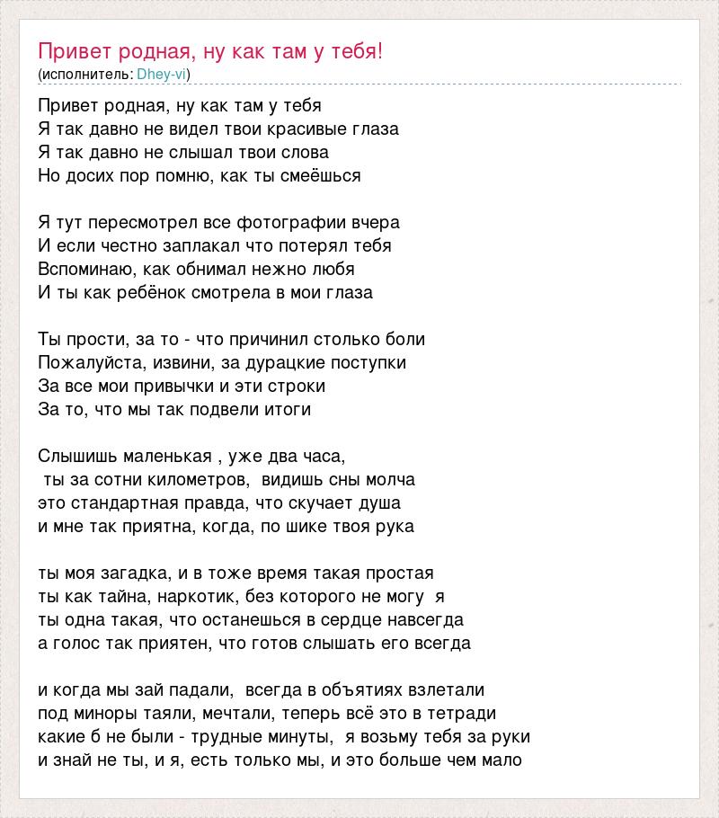 Привет родная, ну как там у тебя Я так давно не видел твои красивые глаза Я так давно не слышал твои слова Но досих пор помню, как ты смеёшься Я тут пересмотрел все фотографии вчера И если честно заплакал что потерял тебя Вспоминаю, как обнимал нежно любя И ты как ребёнок смотрела в мои глаза Ты прости, за то - что причинил столько боли Пожалуйста, извини, за дурацкие поступки За все мои привычки и эти строки За то, что мы так подвели итоги Слышишь маленькая , уже два часа, ты за сотни километров, видишь сны молча это стандартная правда, что скучает душа и мне так приятна, когда, по шике твоя рука ты моя загадка, и в тоже время такая простая ты как тайна, наркотик, без которого не могу я ты одна такая, что останешься в сердце навсегда а голос так приятен, что готов слышать его всегда и когда мы зай падали, всегда в объятиях взлетали под миноры таяли, мечтали, теперь всё это в тетради какие б не были - трудные минуты, я возьму тебя за руки и знай не ты, и я, есть только мы, и это больше чем мало