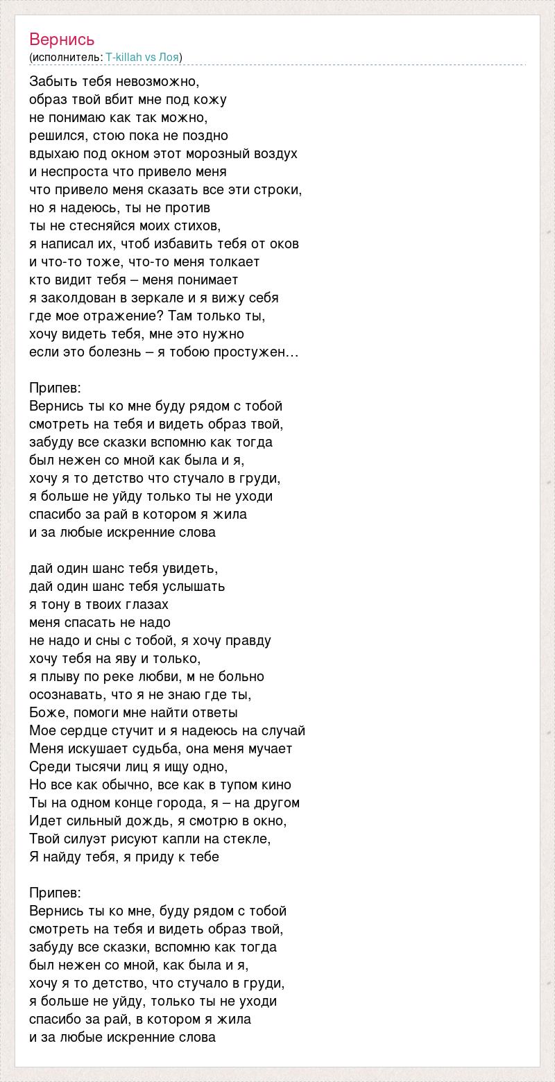 Забыть тебя невозможно, образ твой вбит мне под кожу не понимаю как так можно, решился, стою пока не поздно вдыхаю под окном этот морозный воздух и неспроста что привело меня что привело меня сказать все эти строки, но я надеюсь, ты не против ты не стесняйся моих стихов, я написал их, чтоб избавить тебя от оков и что-то тоже, что-то меня толкает кто видит тебя – меня понимает я заколдован в зеркале и я вижу себя где мое отражение? Там только ты, хочу видеть тебя, мне это нужно если это болезнь – я тобою простужен… Припев: Вернись ты ко мне буду рядом с тобой смотреть на тебя и видеть образ твой, забуду все сказки вспомню как тогда был нежен со мной как была и я, хочу я то детство что стучало в груди, я больше не уйду только ты не уходи спасибо за рай в котором я жила и за любые искренние слова дай один шанс тебя увидеть, дай один шанс тебя услышать я тону в твоих глазах меня спасать не надо не надо и сны с тобой, я хочу правду хочу тебя на яву и только, я плыву по реке любви, м не больно осознавать, что я не знаю где ты, Боже, помоги мне найти ответы Мое сердце стучит и я надеюсь на случай Меня искушает судьба, она меня мучает Среди тысячи лиц я ищу одно, Но все как обычно, все как в тупом кино Ты на одном конце города, я – на другом Идет сильный дождь, я смотрю в окно, Твой силуэт рисуют капли на стекле, Я найду тебя, я приду к тебе Припев: Вернись ты ко мне, буду рядом с тобой смотреть на тебя и видеть образ твой, забуду все сказки, вспомню как тогда был нежен со мной, как была и я, хочу я то детство, что стучало в груди, я больше не уйду, только ты не уходи спасибо за рай, в котором я жила и за любые искренние слова
