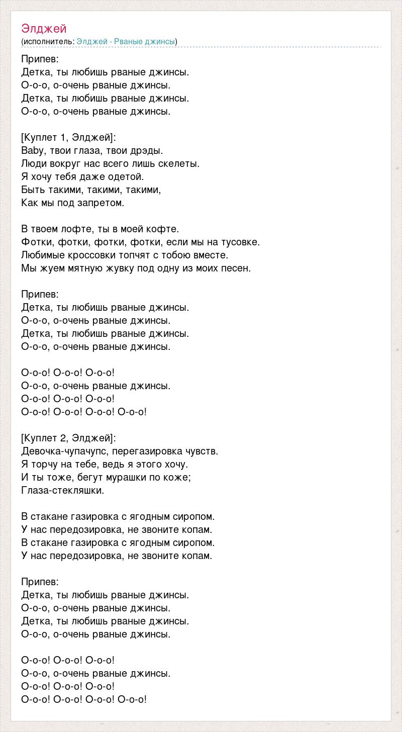 Припев: Детка, ты любишь рваные джинсы. О-о-о, о-очень рваные джинсы. Детка, ты любишь рваные джинсы. О-о-о, о-очень рваные джинсы. [Куплет 1, Элджей]: Baby, твои глаза, твои дрэды. Люди вокруг нас всего лишь скелеты. Я хочу тебя даже одетой. Быть такими, такими, такими, Как мы под запретом. В твоем лофте, ты в моей кофте. Фотки, фотки, фотки, фотки, если мы на тусовке. Любимые кроссовки топчят с тобою вместе. Мы жуем мятную жувку под одну из моих песен. Припев: Детка, ты любишь рваные джинсы. О-о-о, о-очень рваные джинсы. Детка, ты любишь рваные джинсы. О-о-о, о-очень рваные джинсы. О-о-о! О-о-о! О-о-о! О-о-о, о-очень рваные джинсы. О-о-о! О-о-о! О-о-о! О-о-о! О-о-о! О-о-о! О-о-о! [Куплет 2, Элджей]: Девочка-чупачупс, перегазировка чувств. Я торчу на тебе, ведь я этого хочу. И ты тоже, бегут мурашки по коже; Глаза-стекляшки. В стакане газировка с ягодным сиропом. У нас передозировка, не звоните копам. В стакане газировка с ягодным сиропом. У нас передозировка, не звоните копам. Припев: Детка, ты любишь рваные джинсы. О-о-о, о-очень рваные джинсы. Детка, ты любишь рваные джинсы. О-о-о, о-очень рваные джинсы. О-о-о! О-о-о! О-о-о! О-о-о, о-очень рваные джинсы. О-о-о! О-о-о! О-о-о! О-о-о! О-о-о! О-о-о! О-о-о!