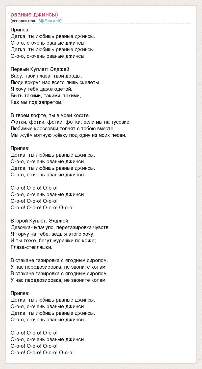 Припев: Детка, ты любишь рваные джинсы. О-о-о, о-очень рваные джинсы. Детка, ты любишь рваные джинсы. О-о-о, о-очень рваные джинсы. Первый Куплет: Элджей Baby, твои глаза, твои дрэды. Люди вокруг нас всего лишь скелеты. Я хочу тебя даже одетой. Быть такими, такими, такими, Как мы под запретом. В твоем лофте, ты в моей кофте. Фотки, фотки, фотки, фотки, если мы на тусовке. Любимые кроссовки топчят с тобою вместе. Мы жуём мятную жёвку под одну из моих песен. Припев: Детка, ты любишь рваные джинсы. О-о-о, о-очень рваные джинсы. Детка, ты любишь рваные джинсы. О-о-о, о-очень рваные джинсы. О-о-о! О-о-о! О-о-о! О-о-о, о-очень рваные джинсы. О-о-о! О-о-о! О-о-о! О-о-о! О-о-о! О-о-о! О-о-о! Второй Куплет: Элджей Девочка-чупачупс, перегазировка чувств. Я торчу на тебе, ведь я этого хочу. И ты тоже, бегут мурашки по коже; Глаза-стекляшки. В стакане газировка с ягодным сиропом. У нас передозировка, не звоните копам. В стакане газировка с ягодным сиропом. У нас передозировка, не звоните копам. Припев: Детка, ты любишь рваные джинсы. О-о-о, о-очень рваные джинсы. Детка, ты любишь рваные джинсы. О-о-о, о-очень рваные джинсы. О-о-о! О-о-о! О-о-о! О-о-о, о-очень рваные джинсы. О-о-о! О-о-о! О-о-о! О-о-о! О-о-о! О-о-о! О-о-о!