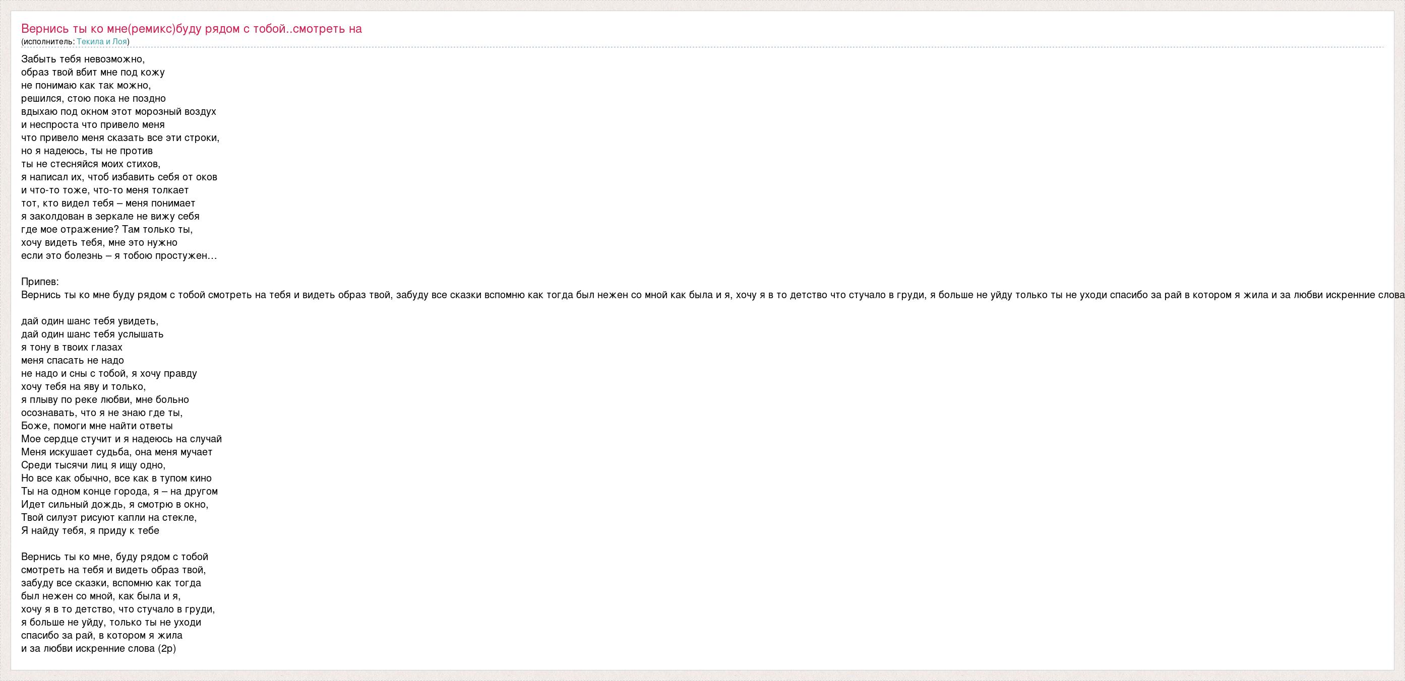 Забыть тебя невозможно, образ твой вбит мне под кожу не понимаю как так можно, решился, стою пока не поздно вдыхаю под окном этот морозный воздух и неспроста что привело меня что привело меня сказать все эти строки, но я надеюсь, ты не против ты не стесняйся моих стихов, я написал их, чтоб избавить себя от оков и что-то тоже, что-то меня толкает тот, кто видел тебя – меня понимает я заколдован в зеркале не вижу себя где мое отражение? Там только ты, хочу видеть тебя, мне это нужно если это болезнь – я тобою простужен… Припев: Вернись ты ко мне буду рядом с тобой смотреть на тебя и видеть образ твой, забуду все сказки вспомню как тогда был нежен со мной как была и я, хочу я в то детство что стучало в груди, я больше не уйду только ты не уходи спасибо за рай в котором я жила и за любви искренние слова дай один шанс тебя увидеть, дай один шанс тебя услышать я тону в твоих глазах меня спасать не надо не надо и сны с тобой, я хочу правду хочу тебя на яву и только, я плыву по реке любви, мне больно осознавать, что я не знаю где ты, Боже, помоги мне найти ответы Мое сердце стучит и я надеюсь на случай Меня искушает судьба, она меня мучает Среди тысячи лиц я ищу одно, Но все как обычно, все как в тупом кино Ты на одном конце города, я – на другом Идет сильный дождь, я смотрю в окно, Твой силуэт рисуют капли на стекле, Я найду тебя, я приду к тебе Вернись ты ко мне, буду рядом с тобой смотреть на тебя и видеть образ твой, забуду все сказки, вспомню как тогда был нежен со мной, как была и я, хочу я в то детство, что стучало в груди, я больше не уйду, только ты не уходи спасибо за рай, в котором я жила и за любви искренние слова (2р)