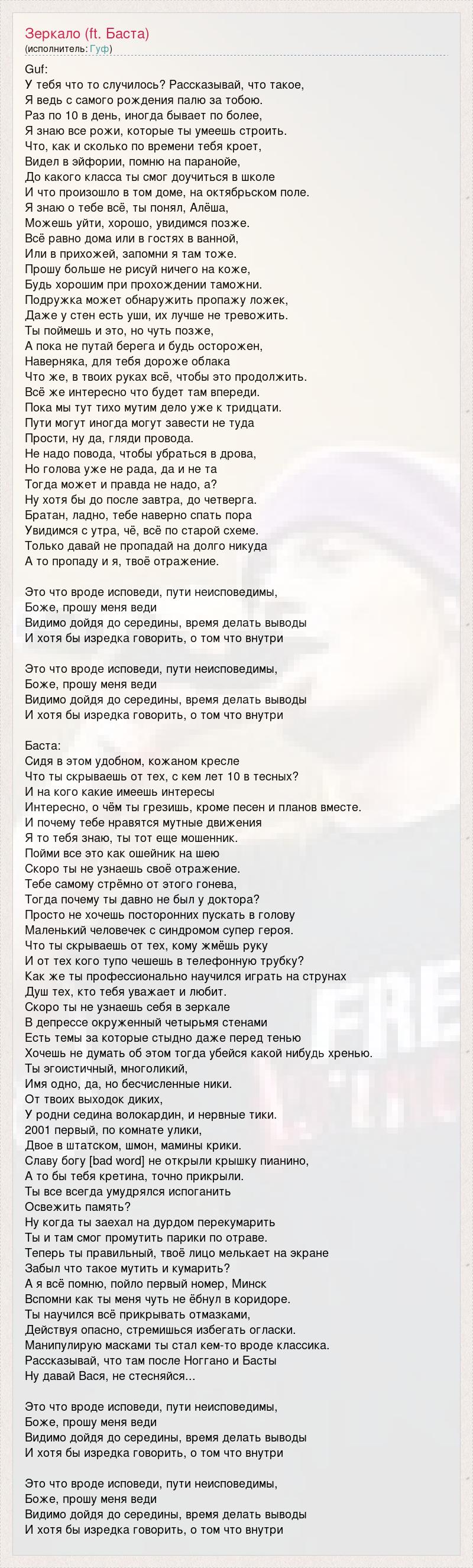 Guf: У тебя что то случилось? Рассказывай, что такое, Я ведь с самого рождения палю за тобою. Раз по 10 в день, иногда бывает по более, Я знаю все рожи, которые ты умеешь строить. Что, как и сколько по времени тебя кроет, Видел в эйфории, помню на паранойе, До какого класса ты смог доучиться в школе И что произошло в том доме, на октябрьском поле. Я знаю о тебе всё, ты понял, Алёша, Можешь уйти, хорошо, увидимся позже. Всё равно дома или в гостях в ванной, Или в прихожей, запомни я там тоже. Прошу больше не рисуй ничего на коже, Будь хорошим при прохождении таможни. Подружка может обнаружить пропажу ложек, Даже у стен есть уши, их лучше не тревожить. Ты поймешь и это, но чуть позже, А пока не путай берега и будь осторожен, Наверняка, для тебя дороже облака Что же, в твоих руках всё, чтобы это продолжить. Всё же интересно что будет там впереди. Пока мы тут тихо мутим дело уже к тридцати. Пути могут иногда могут завести не туда Прости, ну да, гляди провода. Не надо повода, чтобы убраться в дрова, Но голова уже не рада, да и не та Тогда может и правда не надо, а? Ну хотя бы до после завтра, до четверга. Братан, ладно, тебе наверно спать пора Увидимся с утра, чё, всё по старой схеме. Только давай не пропадай на долго никуда А то пропаду и я, твоё отражение. Это что вроде исповеди, пути неисповедимы, Боже, прошу меня веди Видимо дойдя до середины, время делать выводы И хотя бы изредка говорить, о том что внутри Это что вроде исповеди, пути неисповедимы, Боже, прошу меня веди Видимо дойдя до середины, время делать выводы И хотя бы изредка говорить, о том что внутри Баста: Сидя в этом удобном, кожаном кресле Что ты скрываешь от тех, с кем лет 10 в тесных? И на кого какие имеешь интересы Интересно, о чём ты грезишь, кроме песен и планов вместе. И почему тебе нравятся мутные движения Я то тебя знаю, ты тот еще мошенник. Пойми все это как ошейник на шею Скоро ты не узнаешь своё отражение. Тебе самому стрёмно от этого гонева, Тогда почему ты давно не был у доктора? Просто не хочешь посторонних пускать в голову Маленький человечек с синдромом супер героя. Что ты скрываешь от тех, кому жмёшь руку И от тех кого тупо чешешь в телефонную трубку? Как же ты профессионально научился играть на струнах Душ тех, кто тебя уважает и любит. Скоро ты не узнаешь себя в зеркале В депрессе окруженный четырьмя стенами Есть темы за которые стыдно даже перед тенью Хочешь не думать об этом тогда убейся какой нибудь хренью. Ты эгоистичный, многоликий, Имя одно, да, но бесчисленные ники. От твоих выходок диких, У родни седина волокардин, и нервные тики. 2001 первый, по комнате улики, Двое в штатском, шмон, мамины крики. Славу богу [bad word] не открыли крышку пианино, А то бы тебя кретина, точно прикрыли. Ты все всегда умудрялся испоганить Освежить память? Ну когда ты заехал на дурдом перекумарить Ты и там смог промутить парики по отраве. Теперь ты правильный, твоё лицо мелькает на экране Забыл что такое мутить и кумарить? А я всё помню, пойло первый номер, Минск Вспомни как ты меня чуть не ёбнул в коридоре. Ты научился всё прикрывать отмазками, Действуя опасно, стремишься избегать огласки. Манипулирую масками ты стал кем-то вроде классика. Рассказывай, что там после Ноггано и Басты Ну давай Вася, не стесняйся... Это что вроде исповеди, пути неисповедимы, Боже, прошу меня веди Видимо дойдя до середины, время делать выводы И хотя бы изр