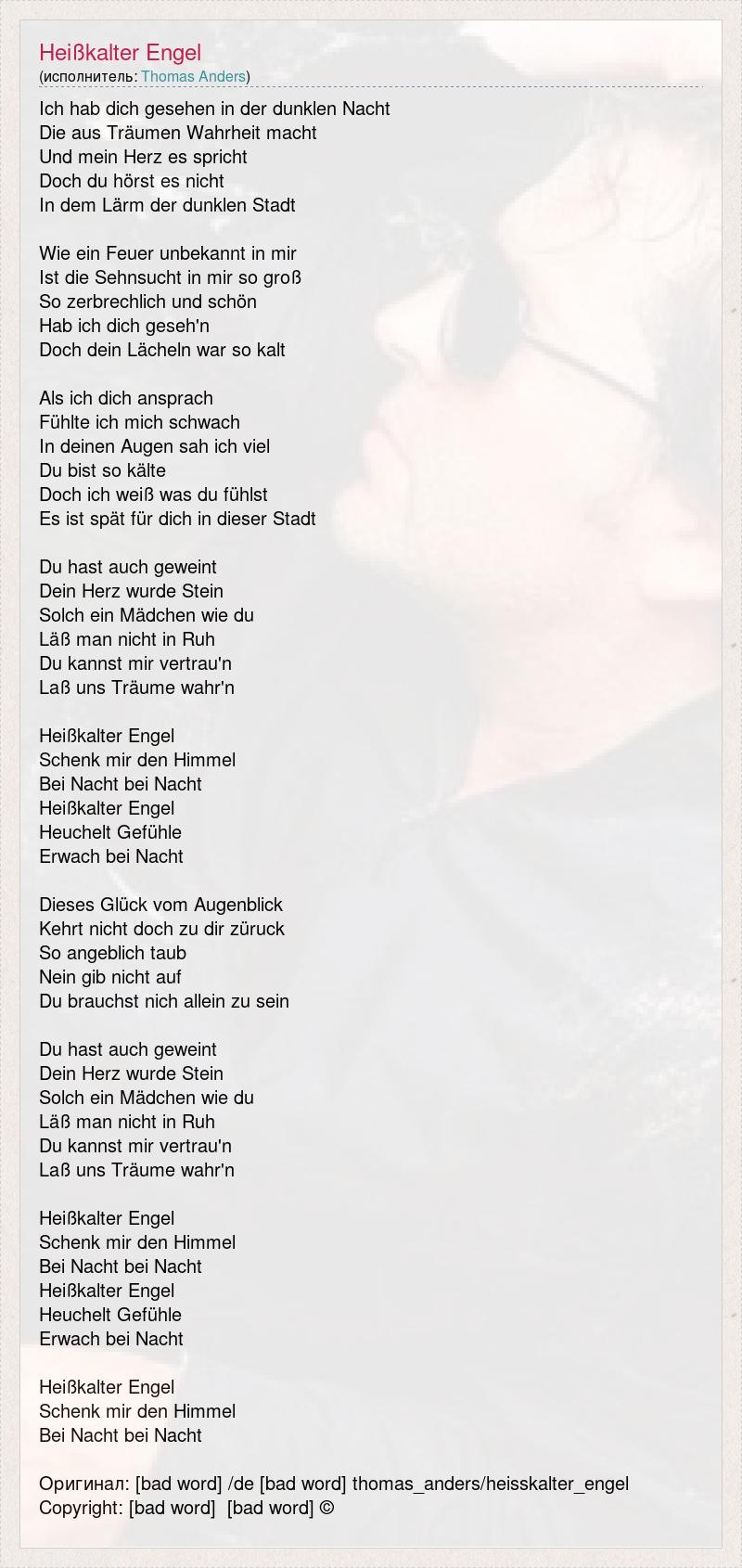 Ich hab dich gesehen in der dunklen Nacht Die aus Träumen Wahrheit macht Und mein Herz es spricht Doch du hörst es nicht In dem Lärm der dunklen Stadt Wie ein Feuer unbekannt in mir Ist die Sehnsucht in mir so groß So zerbrechlich und schön Hab ich dich geseh'n Doch dein Lächeln war so kalt Als ich dich ansprach Fühlte ich mich schwach In deinen Augen sah ich viel Du bist so kälte Doch ich weiß was du fühlst Es ist spät für dich in dieser Stadt Du hast auch geweint Dein Herz wurde Stein Solch ein Mädchen wie du Läß man nicht in Ruh Du kannst mir vertrau'n Laß uns Träume wahr'n Heißkalter Engel Schenk mir den Himmel Bei Nacht bei Nacht Heißkalter Engel Heuchelt Gefühle Erwach bei Nacht Dieses Glück vom Augenblick Kehrt nicht doch zu dir züruck So angeblich taub Nein gib nicht auf Du brauchst nich allein zu sein Du hast auch geweint Dein Herz wurde Stein Solch ein Mädchen wie du Läß man nicht in Ruh Du kannst mir vertrau'n Laß uns Träume wahr'n Heißkalter Engel Schenk mir den Himmel Bei Nacht bei Nacht Heißkalter Engel Heuchelt Gefühle Erwach bei Nacht Heißkalter Engel Schenk mir den Himmel Bei Nacht bei Nacht Оригинал: [bad word] /de [bad word] thomas_anders/heisskalter_engel Copyright: [bad word] [bad word] ©