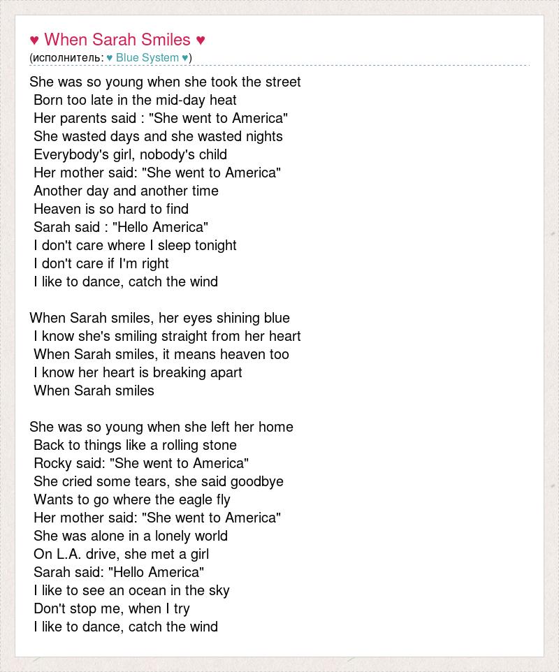 She was so young when she took the street Born too late in the mid-day heat Her parents said : "She went to America" She wasted days and she wasted nights Everybody's girl, nobody's child Her mother said: "She went to America" Another day and another time Heaven is so hard to find Sarah said : "Hello America" I don't care where I sleep tonight I don't care if I'm right I like to dance, catch the wind When Sarah smiles, her eyes shining blue I know she's smiling straight from her heart When Sarah smiles, it means heaven too I know her heart is breaking apart When Sarah smiles She was so young when she left her home Back to things like a rolling stone Rocky said: "She went to America" She cried some tears, she said goodbye Wants to go where the eagle fly Her mother said: "She went to America" She was alone in a lonely world On L.A. drive, she met a girl Sarah said: "Hello America" I like to see an ocean in the sky Don't stop me, when I try I like to dance, catch the wind