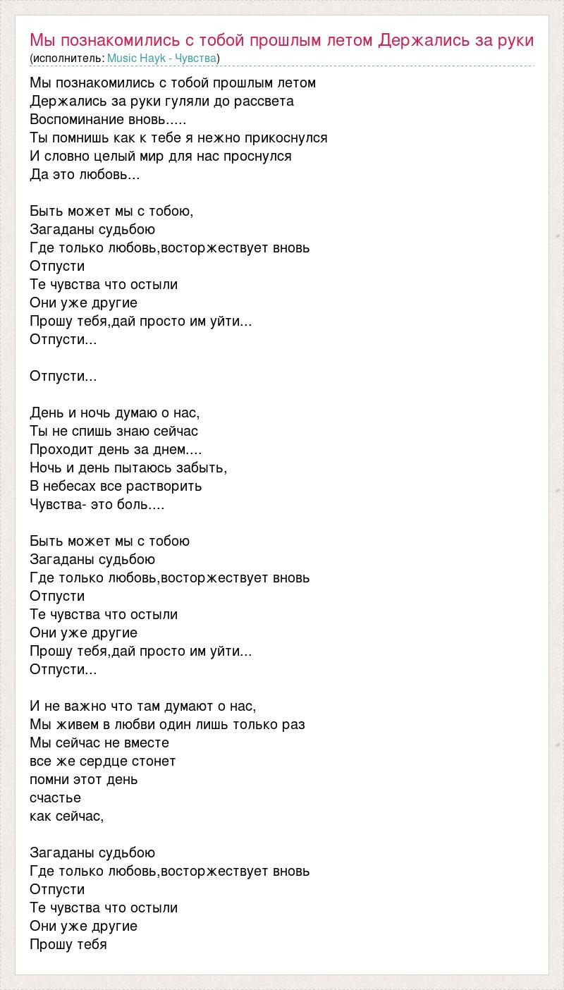Мы познакомились с тобой прошлым летом Держались за руки гуляли до рассвета Воспоминание вновь..... Ты помнишь как к тебе я нежно прикоснулся И словно целый мир для нас проснулся Да это любовь... Быть может мы с тобою, Загаданы судьбою Где только любовь,восторжествует вновь Отпусти Те чувства что остыли Они уже другие Прошу тебя,дай просто им уйти... Отпусти... Отпусти... День и ночь думаю о нас, Ты не спишь знаю сейчас Проходит день за днем.... Ночь и день пытаюсь забыть, В небесах все растворить Чувства- это боль.... Быть может мы с тобою Загаданы судьбою Где только любовь,восторжествует вновь Отпусти Те чувства что остыли Они уже другие Прошу тебя,дай просто им уйти... Отпусти... И не важно что там думают о нас, Мы живем в любви один лишь только раз Мы сейчас не вместе все же сердце стонет помни этот день счастье как сейчас, Загаданы судьбою Где только любовь,восторжествует вновь Отпусти Те чувства что остыли Они уже другие Прошу тебя