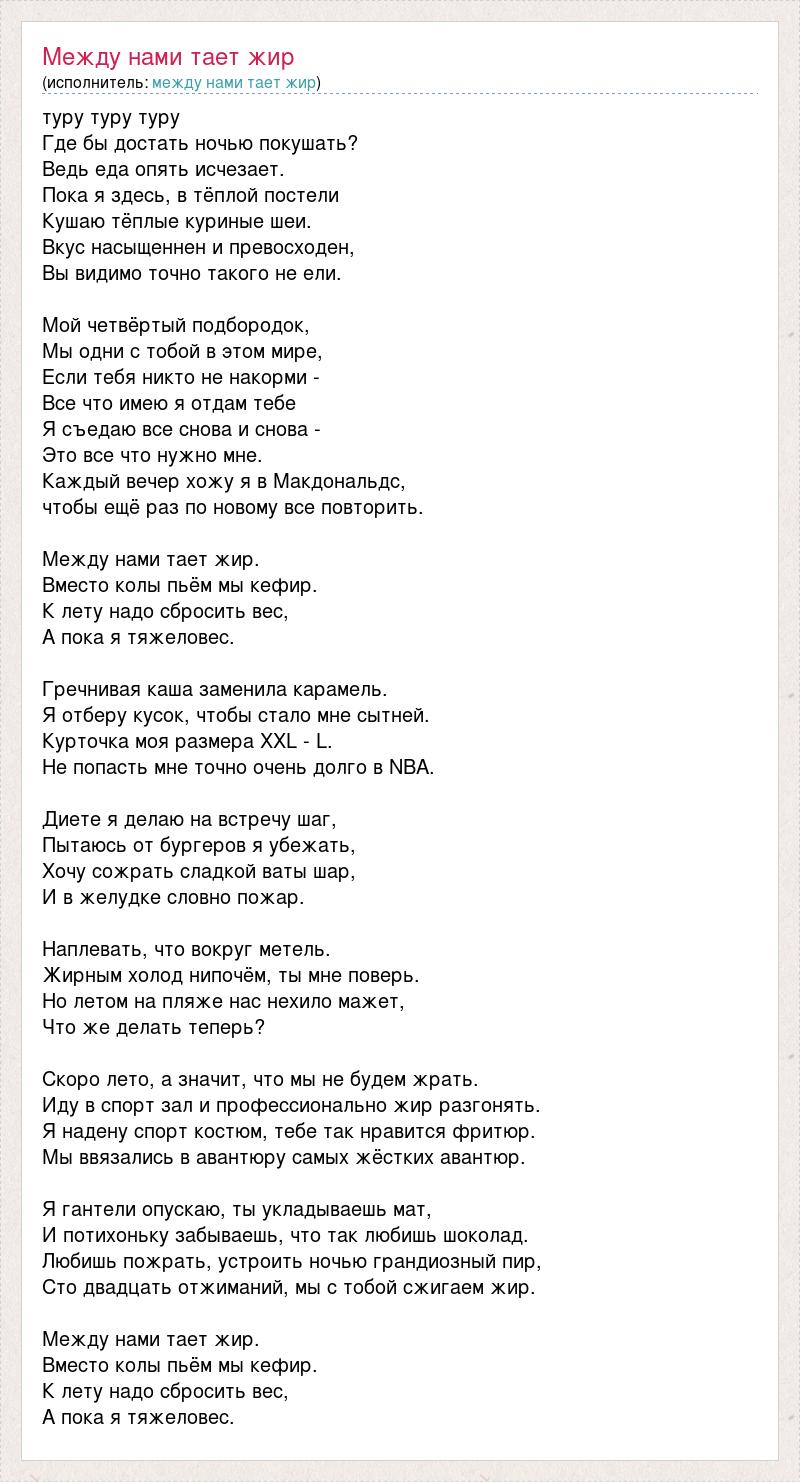 туру туру туру Где бы достать ночью покушать? Ведь еда опять исчезает. Пока я здесь, в тёплой постели Кушаю тёплые куриные шеи. Вкус насыщеннен и превосходен, Вы видимо точно такого не ели. Мой четвёртый подбородок, Мы одни с тобой в этом мире, Если тебя никто не накорми - Все что имею я отдам тебе Я съедаю все снова и снова - Это все что нужно мне. Каждый вечер хожу я в Макдональдс, чтобы ещё раз по новому все повторить. Между нами тает жир. Вместо колы пьём мы кефир. К лету надо сбросить вес, А пока я тяжеловес. Гречнивая каша заменила карамель. Я отберу кусок, чтобы стало мне сытней. Курточка моя размера ХХL - L. Не попасть мне точно очень долго в NBA. Диете я делаю на встречу шаг, Пытаюсь от бургеров я убежать, Хочу сожрать сладкой ваты шар, И в желудке словно пожар. Наплевать, что вокруг метель. Жирным холод нипочём, ты мне поверь. Но летом на пляже нас нехило мажет, Что же делать теперь? Скоро лето, а значит, что мы не будем жрать. Иду в спорт зал и профессионально жир разгонять. Я надену спорт костюм, тебе так нравится фритюр. Мы ввязались в авантюру самых жёстких авантюр. Я гантели опускаю, ты укладываешь мат, И потихоньку забываешь, что так любишь шоколад. Любишь пожрать, устроить ночью грандиозный пир, Сто двадцать отжиманий, мы с тобой сжигаем жир. Между нами тает жир. Вместо колы пьём мы кефир. К лету надо сбросить вес, А пока я тяжеловес.