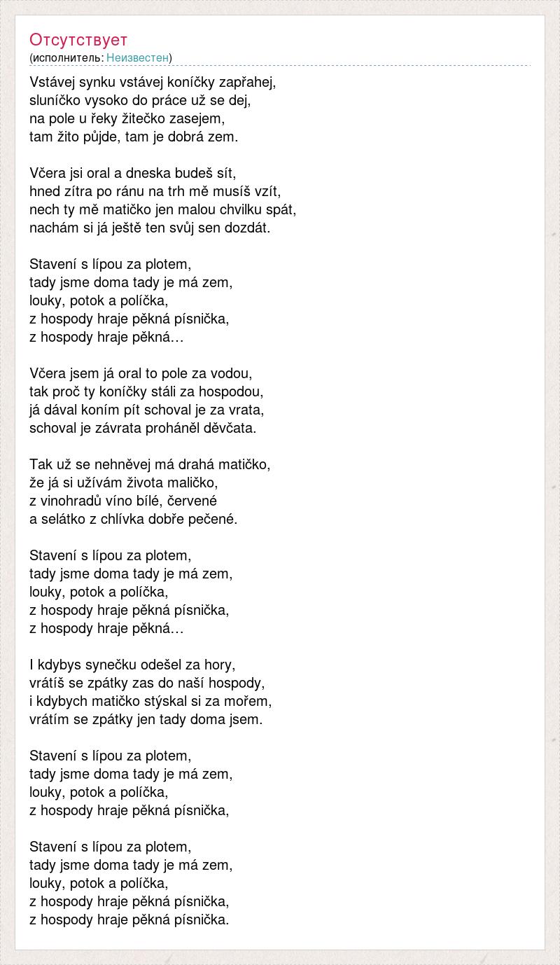 Vstávej synku vstávej koníčky zapřahej, sluníčko vysoko do práce už se dej, na pole u řeky žitečko zasejem, tam žito půjde, tam je dobrá zem. Včera jsi oral a dneska budeš sít, hned zítra po ránu na trh mě musíš vzít, nech ty mě matičko jen malou chvilku spát, nachám si já ještě ten svůj sen dozdát. Stavení s lípou za plotem, tady jsme doma tady je má zem, louky, potok a políčka, z hospody hraje pěkná písnička, z hospody hraje pěkná… Včera jsem já oral to pole za vodou, tak proč ty koníčky stáli za hospodou, já dával koním pít schoval je za vrata, schoval je závrata proháněl děvčata. Tak už se nehněvej má drahá matičko, že já si užívám života maličko, z vinohradů víno bílé, červené a selátko z chlívka dobře pečené. Stavení s lípou za plotem, tady jsme doma tady je má zem, louky, potok a políčka, z hospody hraje pěkná písnička, z hospody hraje pěkná… I kdybys synečku odešel za hory, vrátíš se zpátky zas do naší hospody, i kdybych matičko stýskal si za mořem, vrátím se zpátky jen tady doma jsem. Stavení s lípou za plotem, tady jsme doma tady je má zem, louky, potok a políčka, z hospody hraje pěkná písnička, Stavení s lípou za plotem, tady jsme doma tady je má zem, louky, potok a políčka, z hospody hraje pěkná písnička, z hospody hraje pěkná písnička.