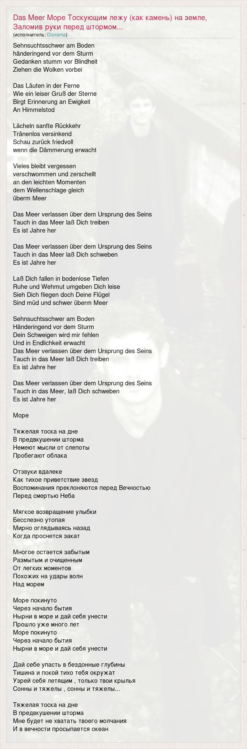 Sehnsuchtsschwer am Boden händeringend vor dem Sturm Gedanken stumm vor Blindheit Ziehen die Wolken vorbei Das Läuten in der Ferne Wie ein leiser Gruß der Sterne Birgt Erinnerung an Ewigkeit An Himmelstod Lächeln sanfte Rückkehr Tränenlos versinkend Schau zurück friedvoll wenn die Dämmerung erwacht Vieles bleibt vergessen verschwommen und zerschellt an den leichten Momenten dem Wellenschlage gleich überm Meer Das Meer verlassen über dem Ursprung des Seins Tauch in das Meer laß Dich treiben Es ist Jahre her Das Meer verlassen über dem Ursprung des Seins Tauch in das Meer laß Dich schweben Es ist Jahre her Laß Dich fallen in bodenlose Tiefen Ruhe und Wehmut umgeben Dich leise Sieh Dich fliegen doch Deine Flügel Sind müd und schwer überm Meer Sehnsuchtsschwer am Boden Händeringend vor dem Sturm Dein Schweigen wird mir fehlen Und in Endlichkeit erwacht Das Meer verlassen über dem Ursprung des Seins Tauch in das Meer laß Dich treiben Es ist Jahre her Das Meer verlassen über dem Ursprung des Seins Tauch in das Meer, laß Dich schweben Es ist Jahre her Море Тяжелая тоска на дне В предвкушении шторма Немеют мысли от слепоты Пробегают облака Отзвуки вдалеке Как тихое приветствие звезд Воспоминания преклоняются перед Вечностью Перед смертью Неба Мягкое возвращение улыбки Бесслезно утопая Мирно оглядываясь назад Когда проснется закат Многое остается забытым Размытым и очищенным От легких моментов Похожих на удары волн Над морем Море покинуто Через начало бытия Нырни в море и дай себя унести Прошло уже много лет Море покинуто Через начало бытия Нырни в море и дай себя унести Дай себе упасть в бездонные глубины Тишина и покой тихо тебя окружат Узрей себя летящим , только твои крылья Сонны и тяжелы , сонны и тяжелы... Тяжелая тоска на дне В предвкушении шторма Мне будет не хватать твоего молчания И в вечности просыпается океан