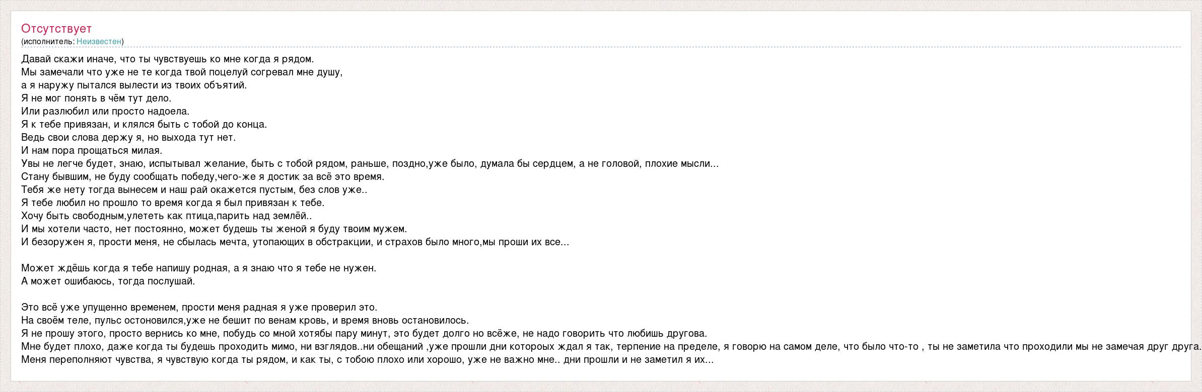 Давай скажи иначе, что ты чувствуешь ко мне когда я рядом. Мы замечали что уже не те когда твой поцелуй согревал мне душу, а я наружу пытался вылести из твоих объятий. Я не мог понять в чём тут дело. Или разлюбил или просто надоела. Я к тебе привязан, и клялся быть с тобой до конца. Ведь свои слова держу я, но выхода тут нет. И нам пора прощаться милая. Увы не легче будет, знаю, испытывал желание, быть с тобой рядом, раньше, поздно,уже было, думала бы сердцем, а не головой, плохие мысли... Стану бывшим, не буду сообщать победу,чего-же я достик за всё это время. Тебя же нету тогда вынесем и наш рай окажется пустым, без слов уже.. Я тебе любил но прошло то время когда я был привязан к тебе. Хочу быть свободным,улететь как птица,парить над землёй.. И мы хотели часто, нет постоянно, может будешь ты женой я буду твоим мужем. И безоружен я, прости меня, не сбылась мечта, утопающих в обстракции, и страхов было много,мы проши их все... Может ждёшь когда я тебе напишу родная, а я знаю что я тебе не нужен. А может ошибаюсь, тогда послушай. Это всё уже упущенно временем, прости меня радная я уже проверил это. На своём теле, пульс остоновился,уже не бешит по венам кровь, и время вновь остановилось. Я не прошу этого, просто вернись ко мне, побудь со мной хотябы пару минут, это будет долго но всёже, не надо говорить что любишь другова. Мне будет плохо, даже когда ты будешь проходить мимо, ни взглядов..ни обещаний ,уже прошли дни котороых ждал я так, терпение на пределе, я говорю на самом деле, что было что-то , ты не заметила что проходили мы не замечая друг друга. Меня переполняют чувства, я чувствую когда ты рядом, и как ты, с тобою плохо или хорошо, уже не важно мне.. дни прошли и не заметил я их...
