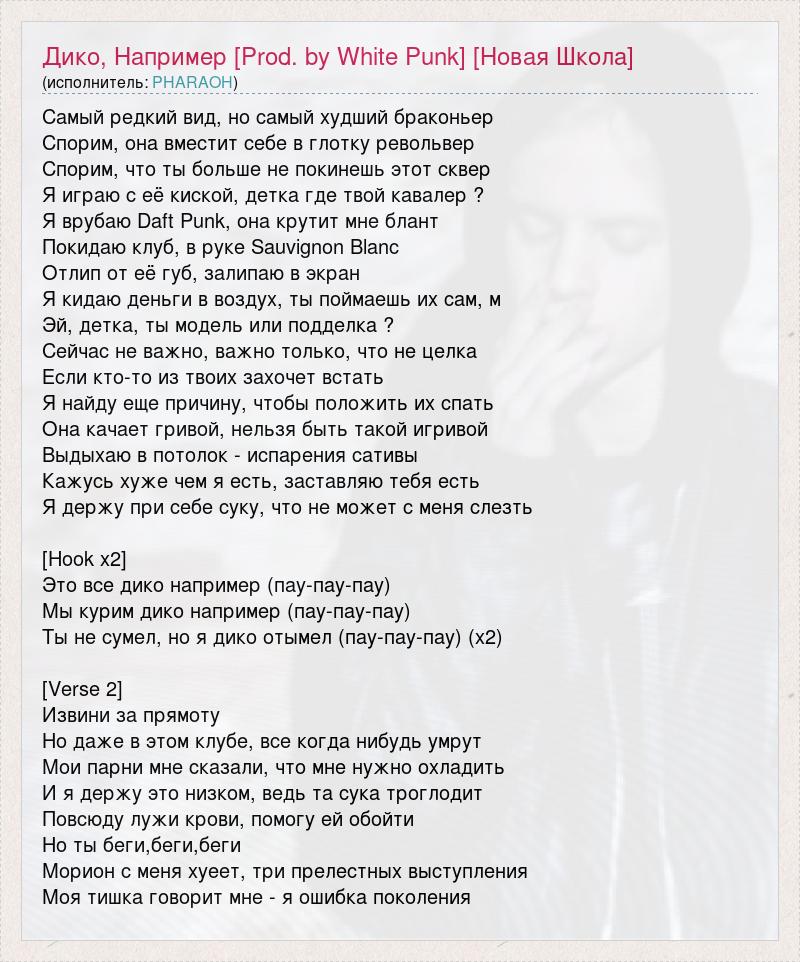 Самый редкий вид, но самый худший браконьер Спорим, она вместит себе в глотку револьвер Спорим, что ты больше не покинешь этот сквер Я играю с её киской, детка где твой кавалер ? Я врубаю Daft Punk, она крутит мне блант Покидаю клуб, в руке Sauvignon Blanc Отлип от её губ, залипаю в экран Я кидаю деньги в воздух, ты поймаешь их сам, м Эй, детка, ты модель или подделка ? Сейчас не важно, важно только, что не целка Если кто-то из твоих захочет встать Я найду еще причину, чтобы положить их спать Она качает гривой, нельзя быть такой игривой Выдыхаю в потолок - испарения сативы Кажусь хуже чем я есть, заставляю тебя есть Я держу при себе суку, что не может с меня слезть [Hook x2] Это все дико например (пау-пау-пау) Мы курим дико например (пау-пау-пау) Ты не сумел, но я дико отымел (пау-пау-пау) (x2) [Verse 2] Извини за прямоту Но даже в этом клубе, все когда нибудь умрут Мои парни мне сказали, что мне нужно охладить И я держу это низком, ведь та сука троглодит Повсюду лужи крови, помогу ей обойти Но ты беги,беги,беги Морион с меня хуеет, три прелестных выступления Моя тишка говорит мне - я ошибка поколения