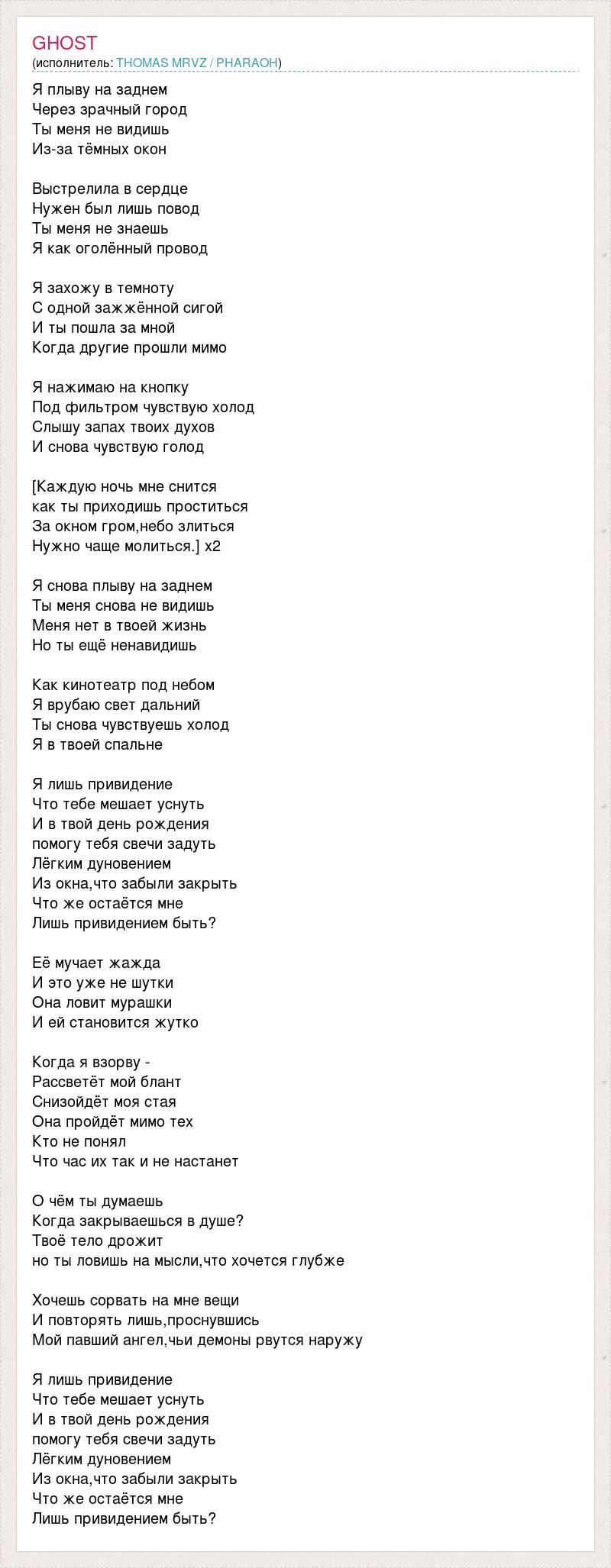 Я плыву на заднем Через зрачный город Ты меня не видишь Из-за тёмных окон Выстрелила в сердце Нужен был лишь повод Ты меня не знаешь Я как оголённый провод Я захожу в темноту С одной зажжённой сигой И ты пошла за мной Когда другие прошли мимо Я нажимаю на кнопку Под фильтром чувствую холод Слышу запах твоих духов И снова чувствую голод [Каждую ночь мне снится как ты приходишь проститься За окном гром,небо злиться Нужно чаще молиться.] x2 Я снова плыву на заднем Ты меня снова не видишь Меня нет в твоей жизнь Но ты ещё ненавидишь Как кинотеатр под небом Я врубаю свет дальний Ты снова чувствуешь холод Я в твоей спальне Я лишь привидение Что тебе мешает уснуть И в твой день рождения помогу тебя свечи задуть Лёгким дуновением Из окна,что забыли закрыть Что же остаётся мне Лишь привидением быть? Её мучает жажда И это уже не шутки Она ловит мурашки И ей становится жутко Когда я взорву - Рассветёт мой блант Снизойдёт моя стая Она пройдёт мимо тех Кто не понял Что час их так и не настанет О чём ты думаешь Когда закрываешься в душе? Твоё тело дрожит но ты ловишь на мысли,что хочется глубже Хочешь сорвать на мне вещи И повторять лишь,проснувшись Мой павший ангел,чьи демоны рвутся наружу Я лишь привидение Что тебе мешает уснуть И в твой день рождения помогу тебя свечи задуть Лёгким дуновением Из окна,что забыли закрыть Что же остаётся мне Лишь привидением быть?