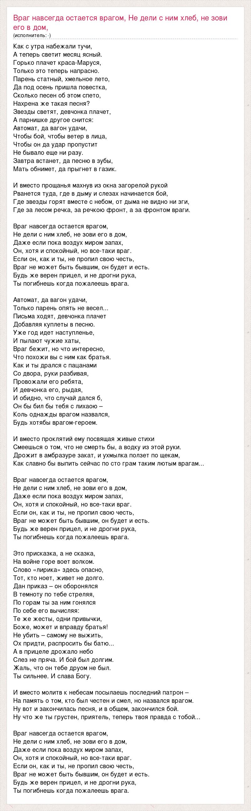 Как с утра набежали тучи, А теперь светит месяц ясный. Горько плачет краса-Маруся, Только это теперь напрасно. Парень статный, хмельное лето, Да под осень пришла повестка, Сколько песен об этом спето, Нахрена же такая песня? Звезды светят, девчонка плачет, А парнишке другое снится: Автомат, да вагон удачи, Чтобы бой, чтобы ветер в лица, Чтобы он да удар пропустит Не бывало еще ни разу. Завтра встанет, да песню в зубы, Мать обнимет, да прыгнет в газик. И вместо прощанья махнув из окна загорелой рукой Рванется туда, где в дыму и слезах начинается бой, Где звезды горят вместе с небом, от дыма не видно ни зги, Где за лесом речка, за речкою фронт, а за фронтом враги. Враг навсегда остается врагом, Не дели с ним хлеб, не зови его в дом, Даже если пока воздух миром запах, Он, хотя и спокойный, но все-таки враг. Если он, как и ты, не пропил свою честь, Враг не может быть бывшим, он будет и есть. Будь же верен прицел, и не дрогни рука, Ты погибнешь когда пожалеешь врага. Автомат, да вагон удачи, Только парень опять не весел... Письма ходят, девчонка плачет Добавляя куплеты в песню. Уже год идет наступленье, И пылают чужие хаты, Враг бежит, но что интересно, Что похожи вы с ним как братья. Как и ты дрался с пацанами Со двора, руки разбивая, Провожали его ребята, И девчонка его, рыдая, И обидно, что случай дался б, Он бы бил бы тебя с лихаою – Коль однажды врагом назвался, Будь хотябы врагом-героем. И вместо проклятий ему посвящая живые стихи Смеешься о том, что не смерть бы, а водку из этой руки. Дрожит в амбразуре закат, и ухмылка ползет по щекам, Как славно бы выпить сейчас по сто грам таким лютым врагам... Враг навсегда остается врагом, Не дели с ним хлеб, не зови его в дом, Даже если пока воздух миром запах, Он, хотя и спокойный, но все-таки враг. Если он, как и ты, не пропил свою честь, Враг не может быть бывшим, он будет и есть. Будь же верен прицел, и не дрогни рука, Ты погибнешь когда пожалеешь врага. Это присказка, а не сказка, На войне горе воет волком. Слово «лирика» здесь опасно, Тот, кто ноет, живет не долго. Дан приказ – он оборонялся В темноту по тебе стреляя, По горам ты за ним гонялся По себе его вычисляя: Те же жесты, одни привычки, Боже, может и вправду братья! Не убить – самому не выжить, Ох придти, распросить бы батю... А в прицеле дрожало небо Слез не пряча. И бой был долгим. Жаль, что он тебе друом не был. Ты сильнее. И слава Богу. И вместо молитв к небесам посылаешь последний патрон – На память о том, кто был честен и смел, но назвался врагом. Ну вот и закончилась песня, и в общем, закончился бой. Ну что же ты грустен, приятель, теперь твоя правда с тобой... Враг навсегда остается врагом, Не дели с ним хлеб, не зови его в дом, Даже если пока воздух миром запах, Он, хотя и спокойный, но все-таки враг. Если он, как и ты, не пропил свою честь, Враг не может быть бывшим, он будет и есть. Будь же верен прицел, и не дрогни рука, Ты погибнешь когда пожалеешь врага.