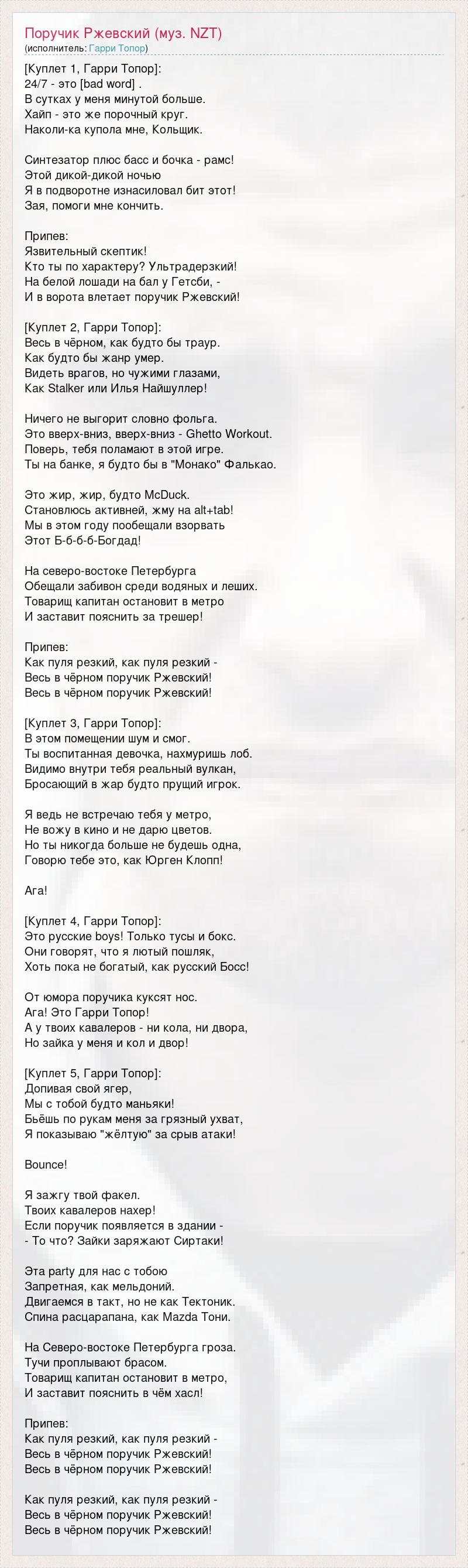 [Куплет 1, Гарри Топор]: 24/7 - это [bad word] . В сутках у меня минутой больше. Хайп - это же порочный круг. Наколи-ка купола мне, Кольщик. Синтезатор плюс басс и бочка - рамс! Этой дикой-дикой ночью Я в подворотне изнасиловал бит этот! Зая, помоги мне кончить. Припев: Язвительный скептик! Кто ты по характеру? Ультрадерзкий! На белой лошади на бал у Гетсби, - И в ворота влетает поручик Ржевский! [Куплет 2, Гарри Топор]: Весь в чёрном, как будто бы траур. Как будто бы жанр умер. Видеть врагов, но чужими глазами, Как Stalker или Илья Найшуллер! Ничего не выгорит словно фольга. Это вверх-вниз, вверх-вниз - Ghetto Workout. Поверь, тебя поламают в этой игре. Ты на банке, я будто бы в "Монако" Фалькао. Это жир, жир, будто McDuck. Становлюсь активней, жму на alt+tab! Мы в этом году пообещали взорвать Этот Б-б-б-б-Богдад! На северо-востоке Петербурга Обещали забивон среди водяных и леших. Товарищ капитан остановит в метро И заставит пояснить за трешер! Припев: Как пуля резкий, как пуля резкий - Весь в чёрном поручик Ржевский! Весь в чёрном поручик Ржевский! [Куплет 3, Гарри Топор]: В этом помещении шум и смог. Ты воспитанная девочка, нахмуришь лоб. Видимо внутри тебя реальный вулкан, Бросающий в жар будто прущий игрок. Я ведь не встречаю тебя у метро, Не вожу в кино и не дарю цветов. Но ты никогда больше не будешь одна, Говорю тебе это, как Юрген Клопп! Ага! [Куплет 4, Гарри Топор]: Это русские boys! Только тусы и бокс. Они говорят, что я лютый пошляк, Хоть пока не богатый, как русский Босс! От юмора поручика куксят нос. Ага! Это Гарри Топор! А у твоих кавалеров - ни кола, ни двора, Но зайка у меня и кол и двор! [Куплет 5, Гарри Топор]: Допивая свой ягер, Мы с тобой будто маньяки! Бьёшь по рукам меня за грязный ухват, Я показываю "жёлтую" за срыв атаки! Bounce! Я зажгу твой факел. Твоих кавалеров нахер! Если поручик появляется в здании - - То что? Зайки заряжают Сиртаки! Эта party для нас с тобою Запретная, как мельдоний. Двигаемся в такт, но не как Тектоник. Спина расцарапана, как Mazda Тони. На Северо-востоке Петербурга гроза. Тучи проплывают брасом. Товарищ капитан остановит в метро, И заставит пояснить в чём хасл! Припев: Как пуля резкий, как пуля резкий - Весь в чёрном поручик Ржевский! Весь в чёрном поручик Ржевский! Как пуля резкий, как пуля резкий - Весь в чёрном поручик Ржевский! Весь в чёрном поручик Ржевский!